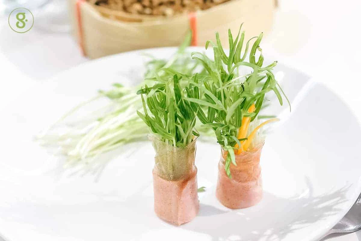 จากนั้นคุณทิพได้นำตัวอย่างของผักบุ้งอ่อนที่โตเต็มวัยแล้วมาสาธิตเป็นเมนู โรลผักบุ้งอ่อนกับซอสครีมสลัดซีฟู้ด อาหารทานเล่นที่ทั้งปรุงง่ายและดีต่อสุขภาพ ซึ่งใช้วัตถุดิบและการเตรียมตามขั้นตอนต่อไปนี้