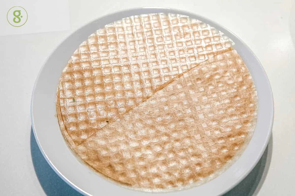 2. เตรียมทำโรลด้วยการตัดแผ่นแป้งออกเป็น 2 ส่วน แล้วเอาแป้งลงจุ่มน้ำ เพื่อให้ห่อง่าย