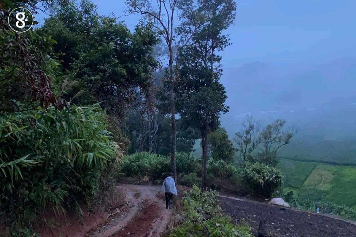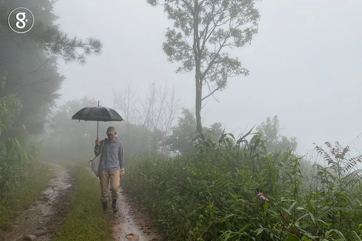 เช้าถัดมา รถกระบะของลุงเสมก็พาพวกเรามาส่ง ณ ปากเส้นทางเดินเท้าระยะทางราว 13 กิโลเมตร สภาพอากาศช่วงปลายฝนต้นหนาวทำให้หมอกปกคลุมหนาทั่วบริเวณ ในระดับยอดดอยหัวเสือที่อยู่ถัดไปไม่ไกลลับจากสายตา พวกเรากระชับเสื้อกันฝนแน่น พร้อมก้าวเท้าออกเดินทางไปตามเส้นทางที่เงียบเชียบปราศจากนักท่องเที่ยว ก่อนลุงเสมจะพาพวกเราหยุดเป็นระยะเพื่อพบกับรายละเอียดระหว่างทาง อย่างต้นตะไคร้ต้น หรือตะไคร้ดอย สมุนไพรยืนต้นที่มักพบตามป่าดิบเขาในหลายจังหวัดภาคเหนือ เป็นหนึ่งในตัวละครสำคัญในครัวของหลากหลายชาติพันธุ์ ด้วยเมล็ดของตะไคร้ต้นนั้นมีกลิ่นรสเปรี้ยวและหอมคล้ายมะนาวผสมตะไคร้ เจือกลิ่นอบเชยจาง ๆ เหมาะกับการนำมาเติมกลิ่นรสให้กับอาหาร ทั้งยังมีสรรพคุณดับคาวเนื้อสัตว์ได้อย่างน่าสนใจ