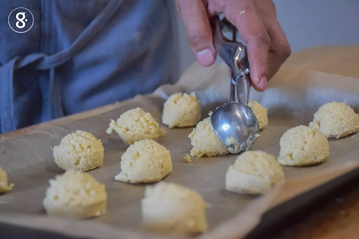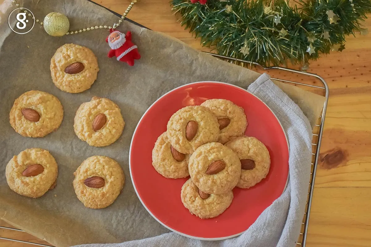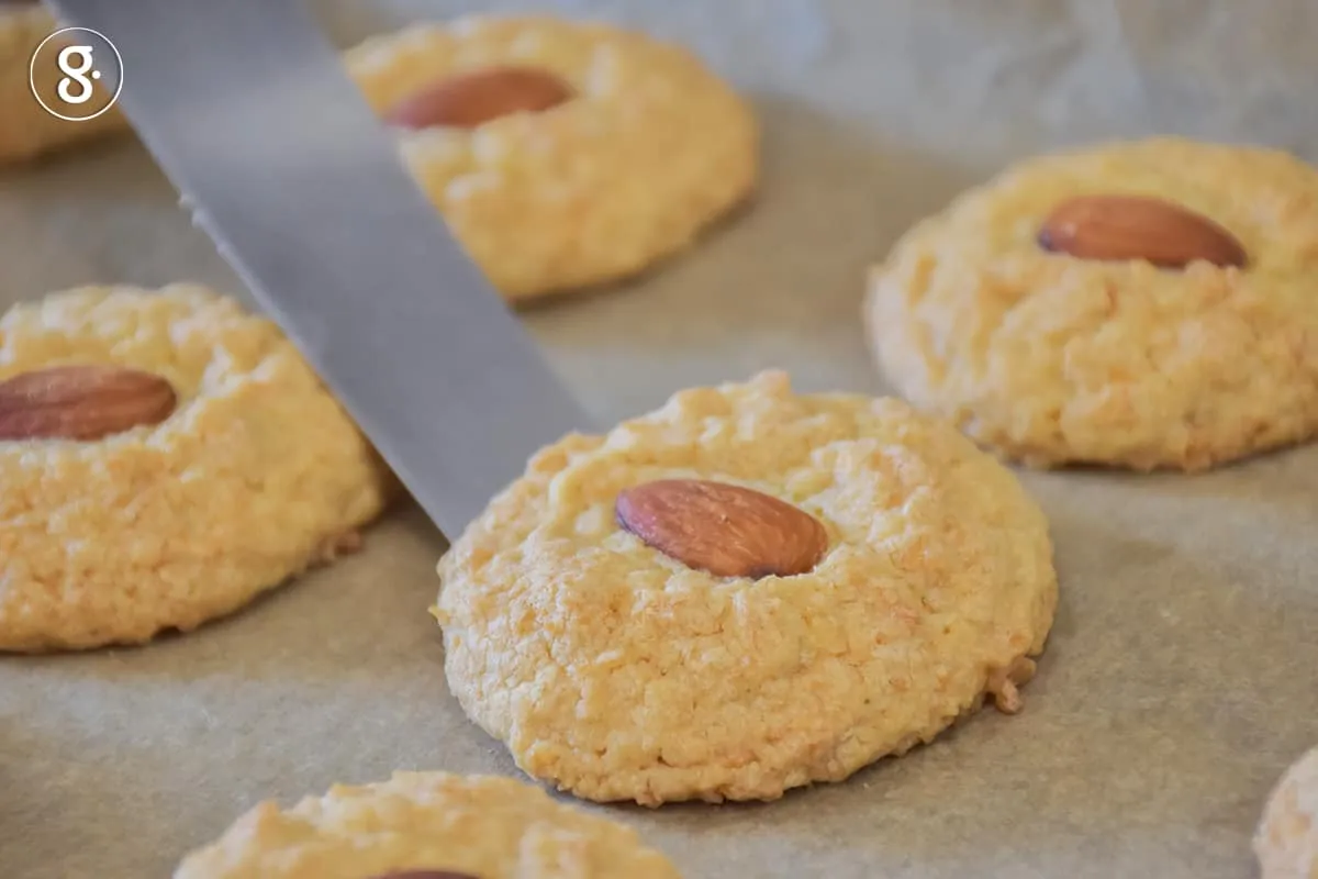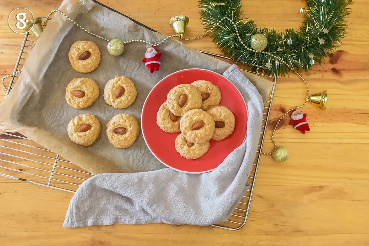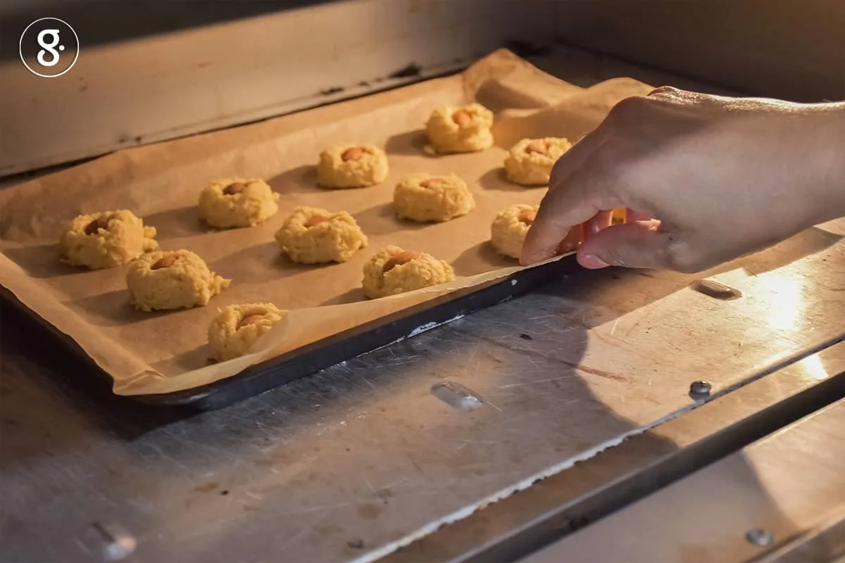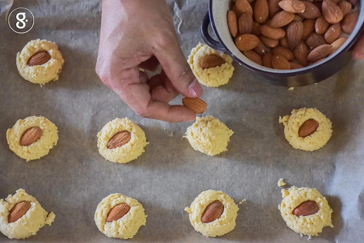 6. ใช้สกู๊ปตักไอศกรีมขนาดเล็กหรือช้อนตักส่วนผสมปั้นเป็นก้อนกลม วางลงบนถาดที่รองด้วยกระดาษรองอบ ใช้ส้อมกดให้แบนเล็กน้อย ตกแต่งด้วยอัลมอนด์