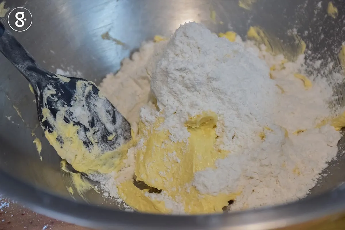 4. ใส่แป้งที่ร่อนไว้ลงไปครึ่งหนึ่ง ใช้พายตะล่อมให้เข้ากันจากนั้นใส่แป้งส่วนที่เหลือผสมให้เข้ากัน