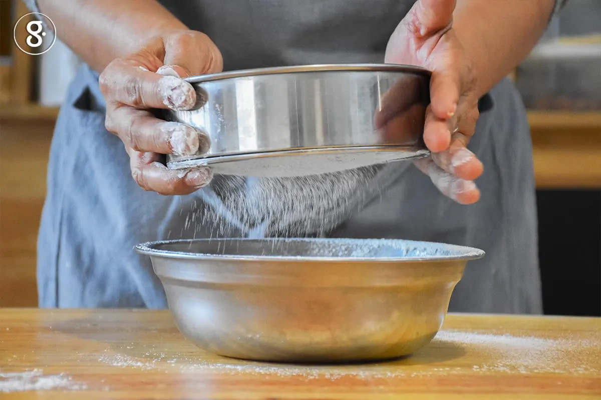 2. ร่อนแป้งข้าวหอมมะลิออร์แกนิก เบกกิ้งโซดา และเกลือป่นเข้าด้วยกัน พักไว้