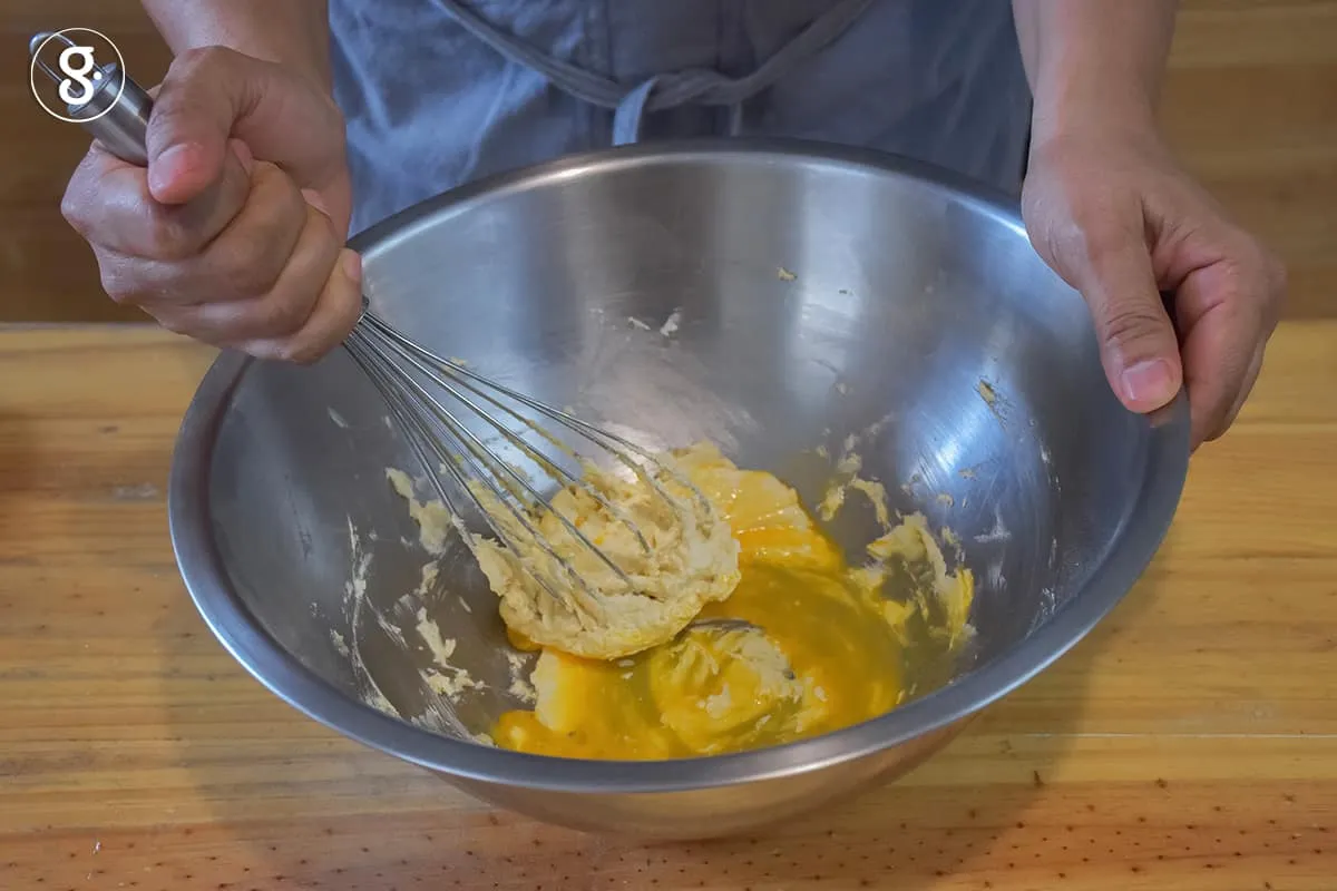 3. ใช้หัวตีตะกร้อ ตีเนยด้วยความเร็วปานกลางจนเนียน ค่อย ๆ ใส่น้ำตาลทรายลงไปจนหมด ต่อมาจึงใส่น้ำตาลทรายแดงแล้วตีต่อจนน้ำตาลละลาย ใส่ไข่ไก่ลงไปตีจนส่วนผสมทั้งหมดเข้ากันและเนื้อเนียนดี