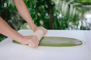 เมื่อเรานวดส่วนผสมเข้ากันได้ที่แล้ว เราก็ทำการพักแป้งของเราไว้ในภาชนะ ประมาณ 25-30 นาที เสร็จแล้วนำก้อนแป้งของเรามารีดคลึงด้วยไม้คลึงแป้ง ให้มีความบางเท่าที่เราทำได้ ระหว่างนี้โรยด้วยแป้งนวลซึ่งก็คือตัวแป้งสาลีสะเมิงของเรา เพื่อกันไม่ให้เจ้าแป้งแผ่นบางของเราติดภาชนะและไม้คลึงแป้ง