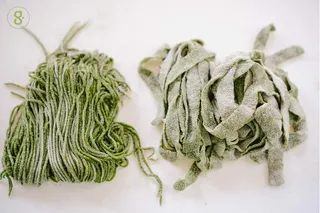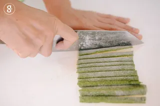 เมื่อคลึงจนบางได้ที่แล้วจัดการพับแผ่นแป้งเข้าหากันสามถึงสี่ชั้น ใช้มีดตัดแผ่นแป้งของเราเป็นเส้นๆ ขนาดตามเราต้องการได้เลย หรือถ้าท่านใดมีเครื่องตัดเส้นบะหมี่หรือเส้นพาสต้า เมื่อคลึงแป้งได้แผ่นบางพอประมาณแล้ว เอาเข้าเครื่องรีดแป้ง และตัดออกเป็นเส้นที่เราต้องการได้เลย ระหว่างนี้อย่าลืมโรยแป้งนวลเข้าไปเพื่อกันไม่ให้เส้นของเราจับตัวเป็นก้อน เท่านี้เราก็ได้เส้นบะหมี่ผักหวานสวยงามตามต้องการแล้ว