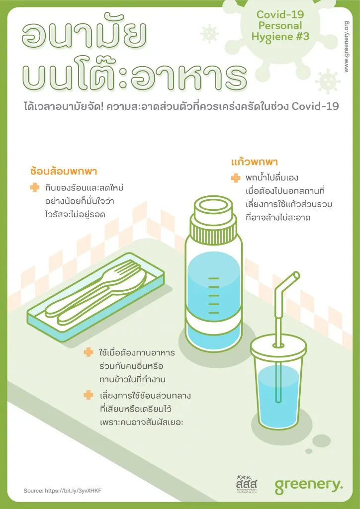 – ใช้ช้อนและตะเกียบพกพา เมื่อต้องทานข้าวในที่ทำงาน เลี่ยงการใช้ช้อนส่วนกลางในห้องครัวไปก่อน เพราะคนอาจสัมผัสเยอะ