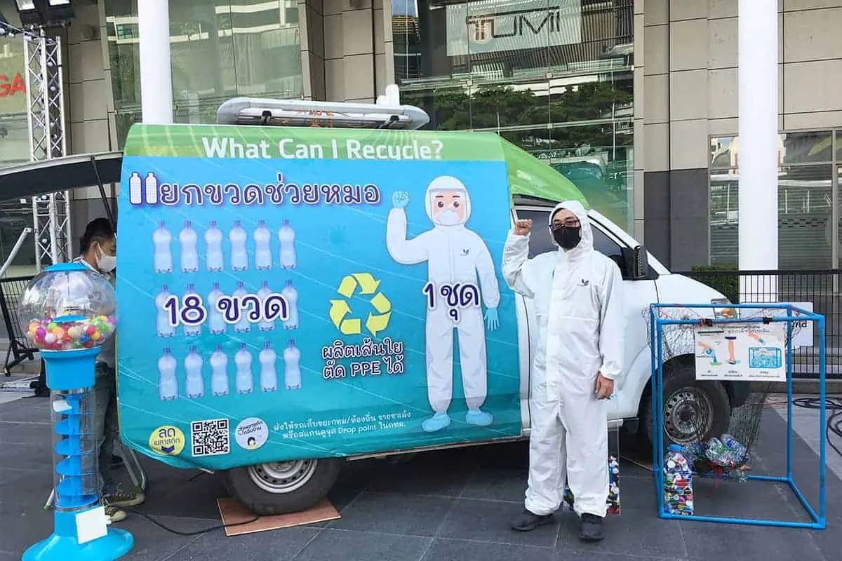 “ในเวลานั้นชุด PPE ขาดตลาด และต้องนำเข้าผ้ามาจากไต้หวัน ช่วงแรกเราทำการระดมทุนและหาโรงงานตัดเย็บที่ได้มาตรฐาน เมื่อระดมทุนเพื่อผลิตได้ประมาณ 2,000 ชุด เครือข่ายก็พบว่าผ้าที่ใช้ตัดชุด เป็นผ้าที่ทำมาจากการรีไซเคิลพลาสติกมาเป็นโพลีเอสเตอร์ เลยเกิดความคิดว่า ทำไมเราไม่ใช้ขยะของคนไทยล่ะ จึงเริ่มต้นร่วมมือกับบริษัทอินโดรามา เวนเจอร์ส ซึ่งมีโรงผลิตเส้นด้ายจากขวดพลาสติกใส ที่เรียกว่า ‘ขวดพีอีที’ หรือ ‘ขวดเพ็ต’ (PET) ในจังหวัดนครปฐม และชักชวนโรงทอผ้าของบริษัทไทยแทฟฟิต้า ที่จังหวัดระยองมาร่วมทำงานกลุ่ม พร้อมกับหาโรงงานตัดเย็บที่ได้มาตรฐาน รวมไปถึงพันธมิตรอื่น ๆ เพื่อหาจุดรับขวด”