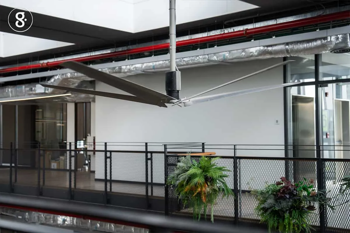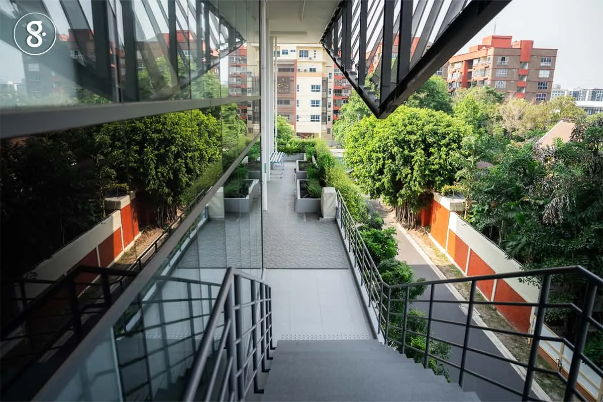เรานั่งคุยกันบริเวณชั้น 6 ของอาคารซึ่งเป็นมุมกาแฟและสันทนาการ ปราศจากแสงจากดวงไฟเพราะใช้ประโยชน์จากแสงธรรมชาติล้วน ๆ แม้จะเป็นโซนที่ไม่มีความเย็นฉ่ำจากเครื่องปรับอากาศ แต่ก็ไม่ได้รู้สึกร้อนจนไม่สบายตัว จากตรงนี้ในระยะไม่กี่สิบเมตร เรามองเห็นพัดลมเพดานตัวใหญ่ติดตั้งอยู่บริเวณโถง ที่เมื่อเอาตัวเข้าไปใกล้จุดนั้นก็สัมผัสได้ถึงความเย็นที่กระทบตัวอย่างชัดเจนด้วยการใช้ประโยชน์จากอากาศที่หมุนเวียนอยู่ภายในอาคาร
