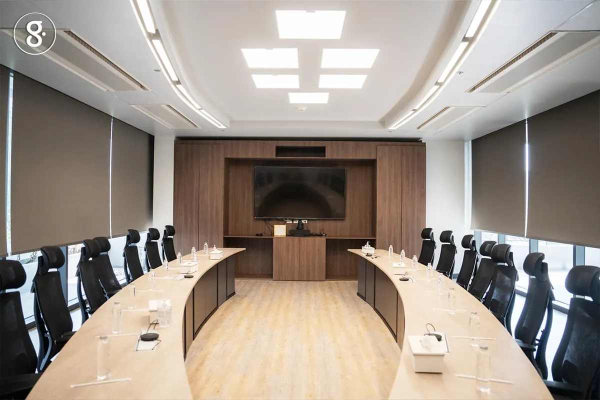 ห้องประชุมห้องหนึ่งที่เป็นเสมือนโชว์รูมงานวิศวกรรม แต่เป็นห้องประชุมที่ใช้งานจริง ความพิเศษคือเป็นห้องที่เงียบสนิทด้วยระบบปรับอากาศแบบพิเศษที่ทดลองทำขึ้น โดยไม่ใช้การส่งลมเย็นไปทั่วห้องตามปกติ แต่ทำพื้นและผนังห้องเย็น เรียบแบบถ้ำที่มีเพดานและพื้นเย็น ด้วยการเดินท่อน้ำเย็นขดไปมาใต้พื้น และอุปกรณ์พิเศษที่เรียกว่า chilled beam “เฉพาะห้องนี้ประหยัดพลังงานได้ประมาณ 30 เปอร์เซ็นต์ และเสียงก็เงียบสนิท เหมาะกับบรรยากาศการประชุม”