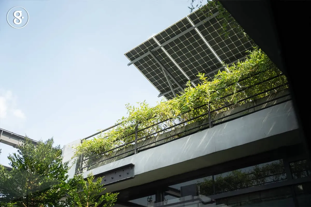 “เราออกแบบหลังคาเพื่อให้ติดตั้งแผงโซลาร์เซลล์ได้เต็มที่ เพื่อให้ผลิตพลังงานได้เยอะที่สุดเท่าที่เราทำได้ มีพื้นที่เท่าไรเราใส่แผงหมดโดยไม่มีเงาบังแสงกัน ตอนนี้เฉพาะหลังคาสำนักงาน เราติดตั้งโซลาร์เซลล์ขนาด 133 Kw (กิโลวัตต์) ผลิตพลังงานไฟฟ้าจากพลังงานทดแทนให้เราใช้ได้ 27 เปอร์เซ็นต์ของพลังงานไฟฟ้าที่เราต้องการ และด้วยการออกแบบระบบต่าง ๆ นานา ทำให้เราลดค่าใช้ไฟได้เดือนละ 60,000 บาทจากค่ารวม 200,000 บาท โดยมีระยะเวลาคุ้มทุน (breakeven point) ประมาณ 6 ปี หลังจากเก็บตัวเลขมาได้เป็นเวลาสองปี เราพบว่าอาคารหลังนี้บริโภคพลังงานไฟฟ้าอยู่ที่ 61 kWh/m2-yr (กิโลวัตต์ชั่วโมงต่อตารางเมตรต่อปี) ถือได้ว่าเป็นอาคารชั้น zero energy building และต่ำกว่าอาคารโดยทั่วไปในกรุงเทพมหานครถึงราว 4 เท่าตัวต่อตารางเมตร