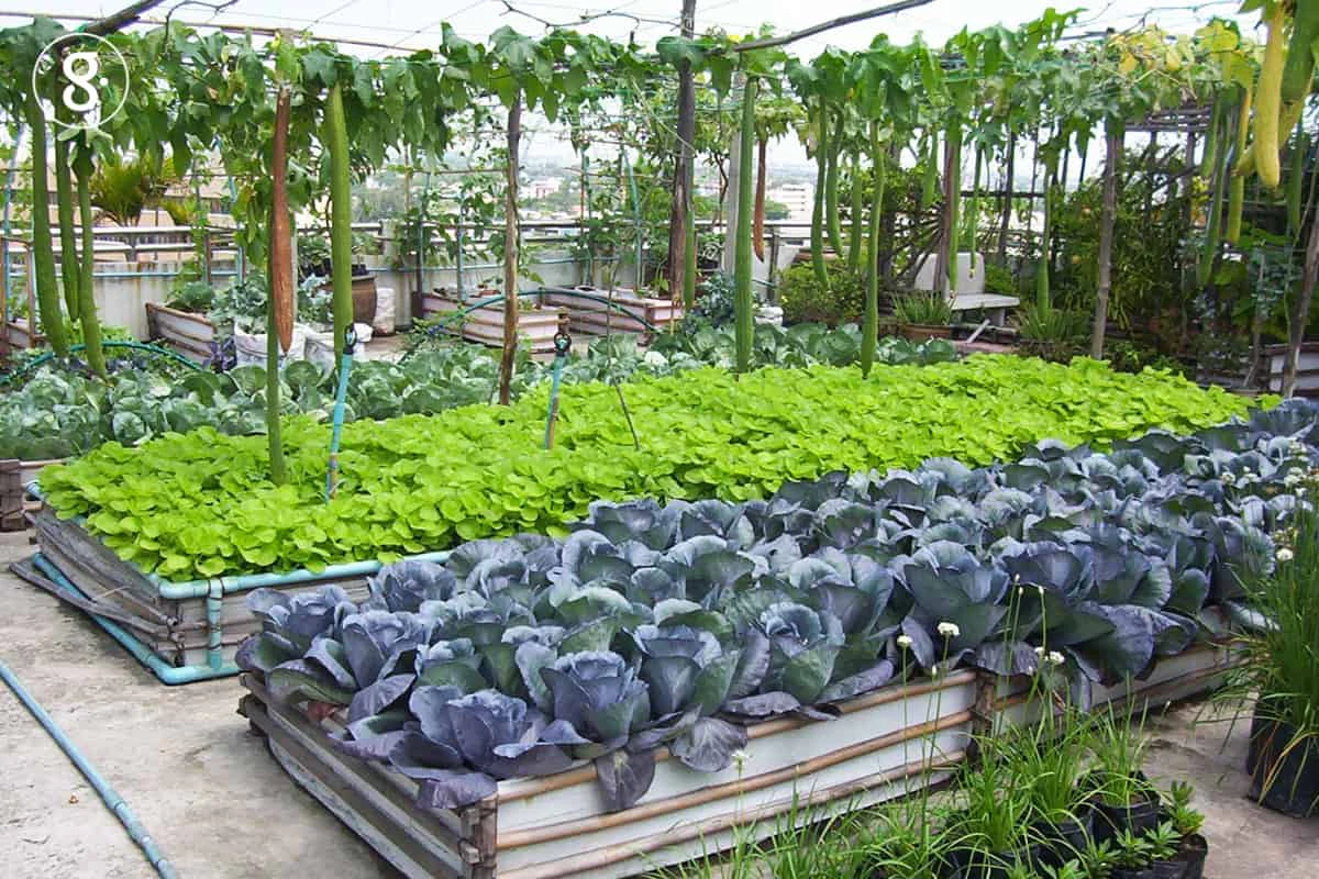 เราควรหาตาข่ายเป็นหลังคากรองแสงให้ให้กับพืชผัก หรืออาจจะทำเป็นซุ้มไม้เลื้อย ปลูกบวบ น้ำเต้า ฟัก แฟง เพื่อให้เป็นหลังคาธรรมชาติให้แก่พืชผักที่ปลูกอยู่ในกระถางหรือในแปลงด้านล่าง