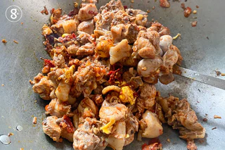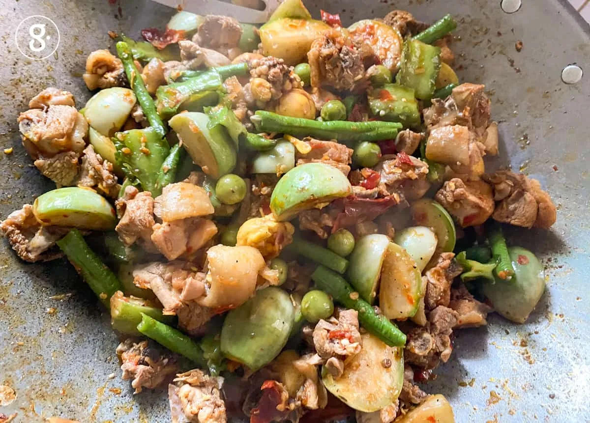 2. ตั้งกระทะให้ร้อน ใส่น้ำมันรำข้าว นำพริกแกงลงผัดจนหอม จากนั้นใส่ไก่บ้านตามลงไปผัด (สามารถนำไก่บ้านไปต้มจนเนื้อนุ่มก่อนนำมาผัดได้ เพื่อลดเวลาในการเคี่ยวแกง) เมื่อไก่สุก เติมผักชนิดสุกยาก อาทิ มะเขือหรือหน่อไม้ลงไป จากนั้นเติมน้ำเล็กน้อยให้พอขลุกขลิก รอจนเดือดอีกครั้ง