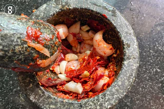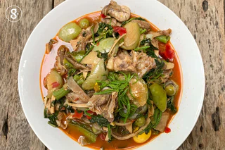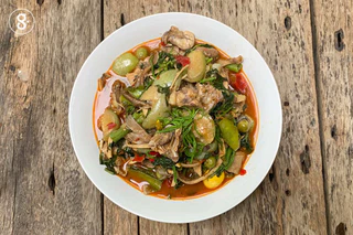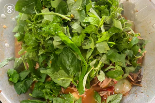 สำคัญคือ ต้องยืนพื้นด้วยผักกลิ่นฉุนอย่างผักเผ็ด ทว่าหากผักเผ็ดหายากจนเกินเอื้อม สามารถระดมชะอมหรือใบชะพลูมาเสริมความอร่อยก็ได้เช่นกัน