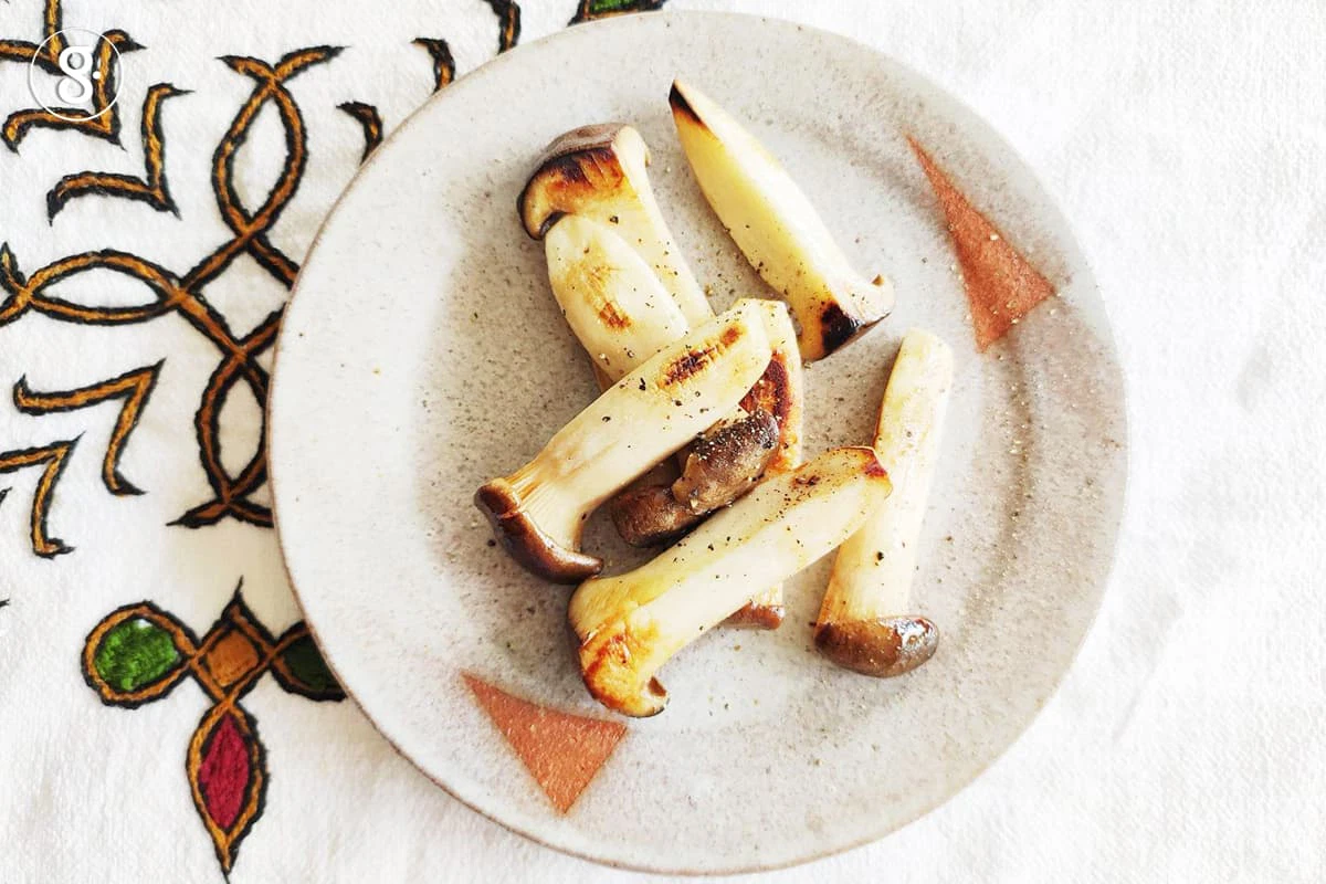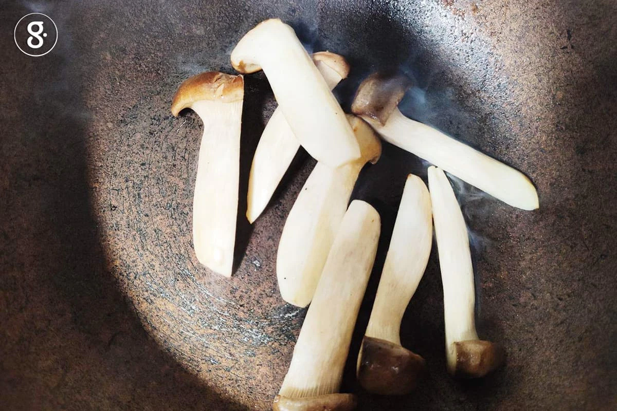 3. ตั้งกระทะใส่น้ำมันเล็กน้อย พอร้อนใส่เห็ดเออรินจิลงไปย่าง ปรุงรสด้วยซีอิ๊วขาว และพริกไทย พักไว้