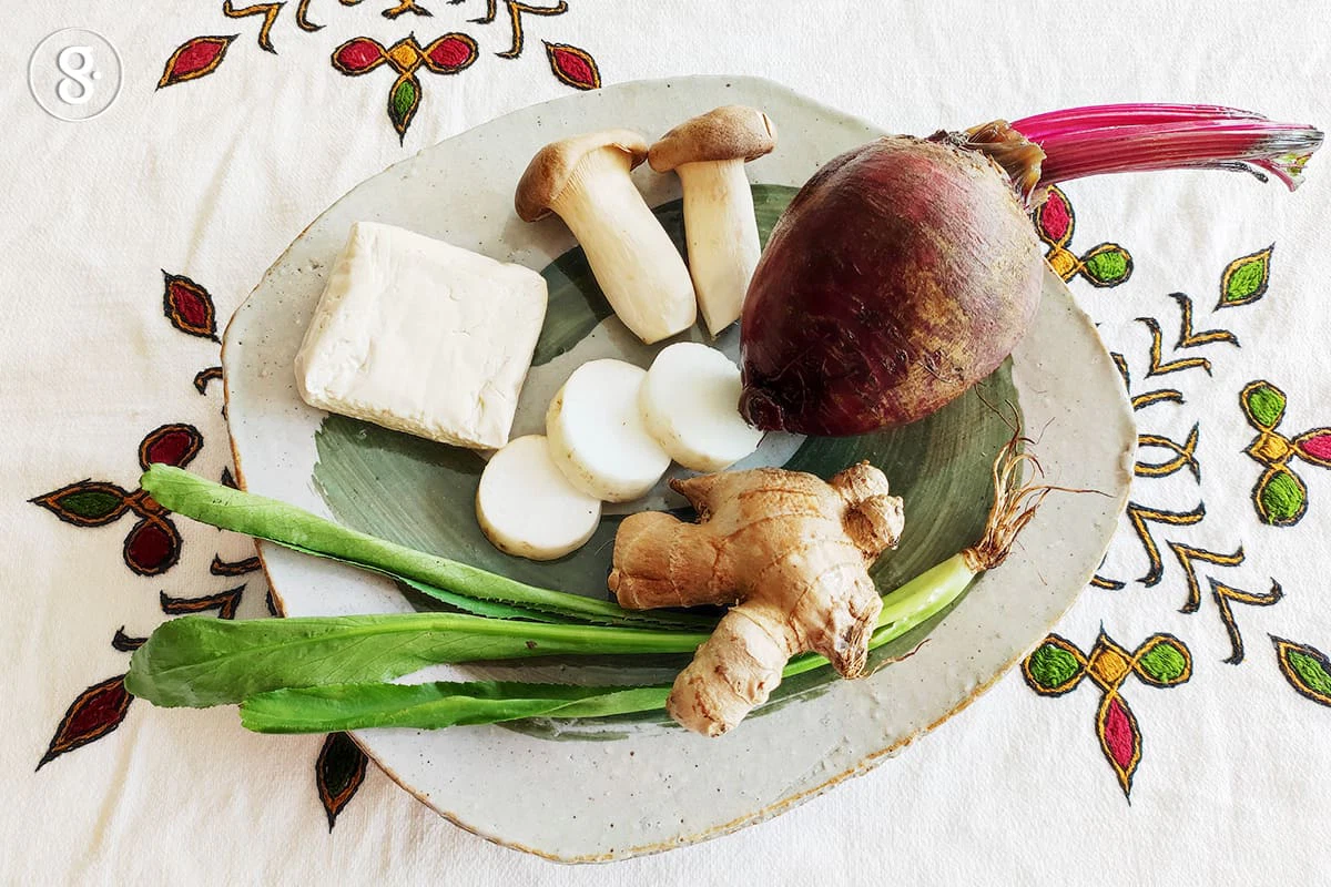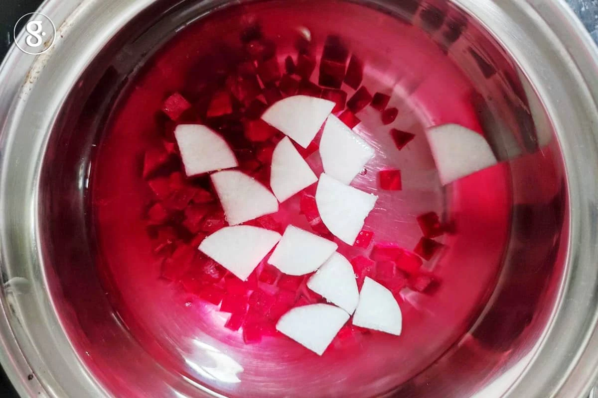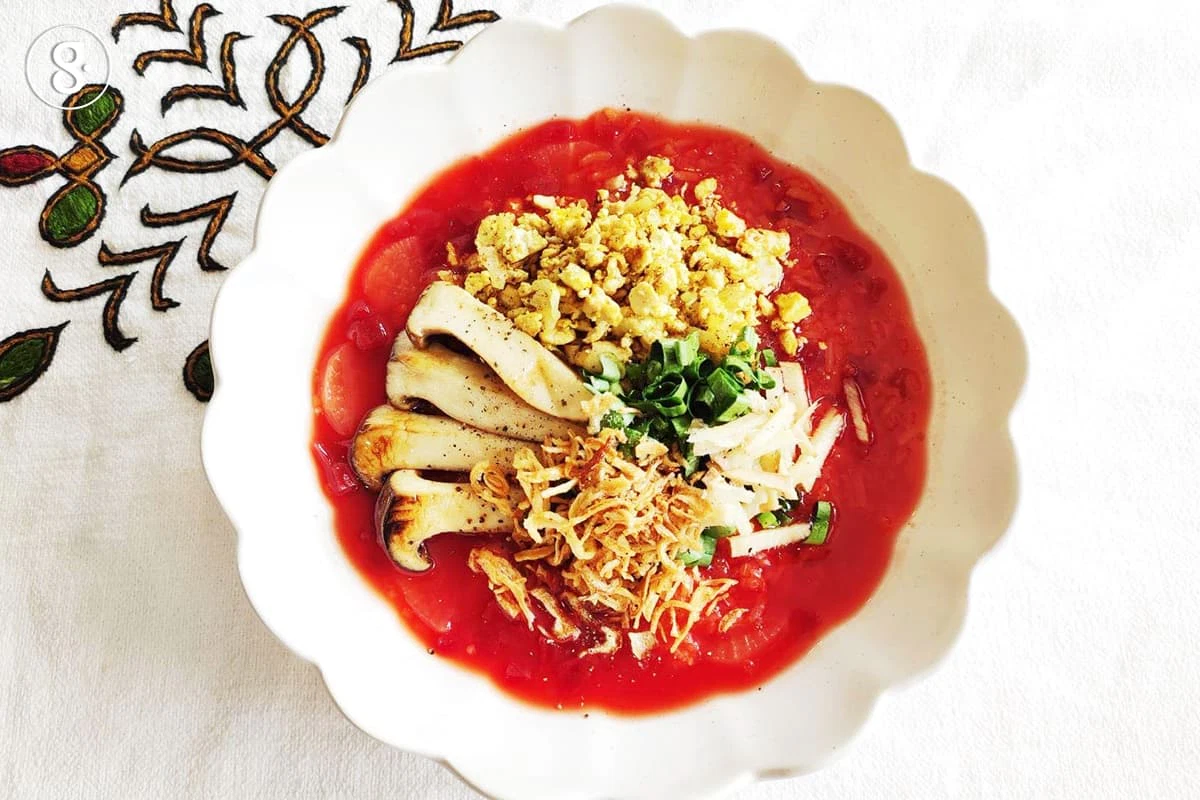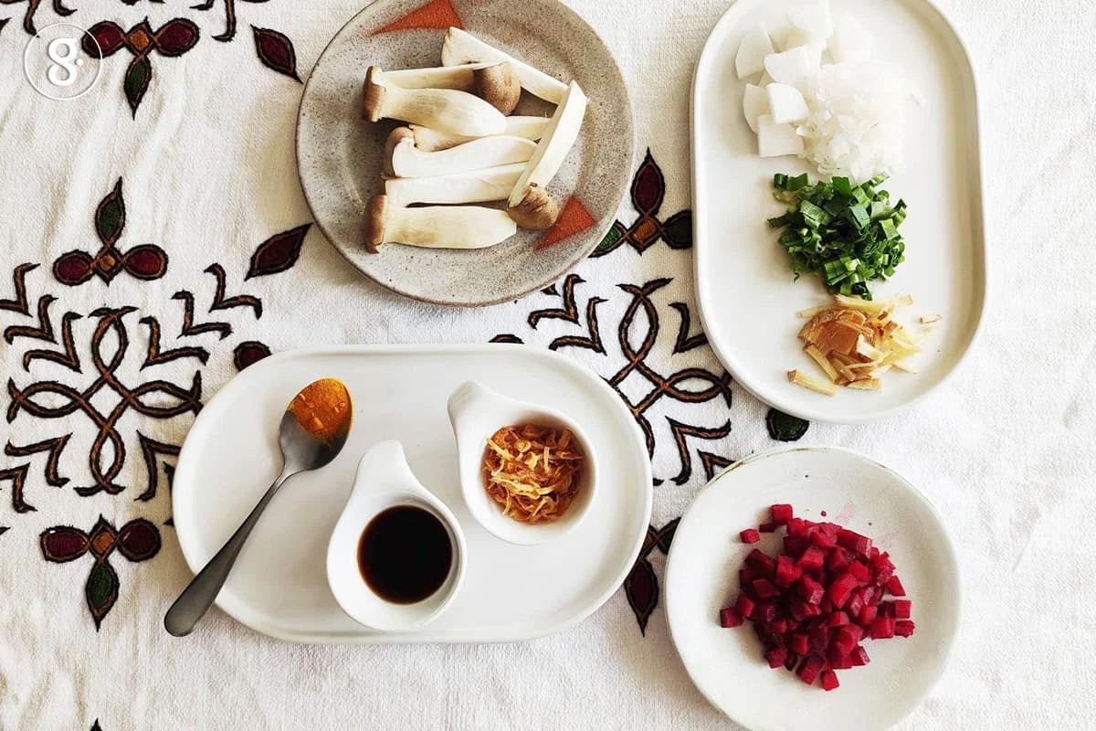 1. ใส่น้ำสะอาดลงหม้อยกขึ้นตั้งไฟต้มให้เดือด หลังจากนั้นใส่บีตรูตและหัวไชเท้าที่หั่นไว้แล้ว ต้มต่อสักพักจนหัวไชเท้าเริ่มใสและสุก จึงใส่ข้าวสวยหุงสุกต้มต่อจนงวดเล็กน้อย ปรุงรสด้วยซีอิ๊วขาว 2 ช้อนชาหรือแล้วแต่ชอบ พักไว้