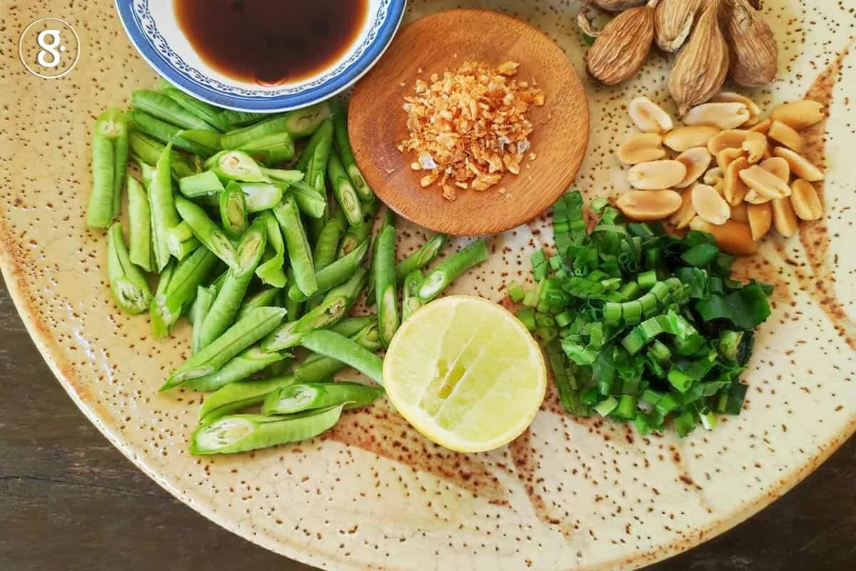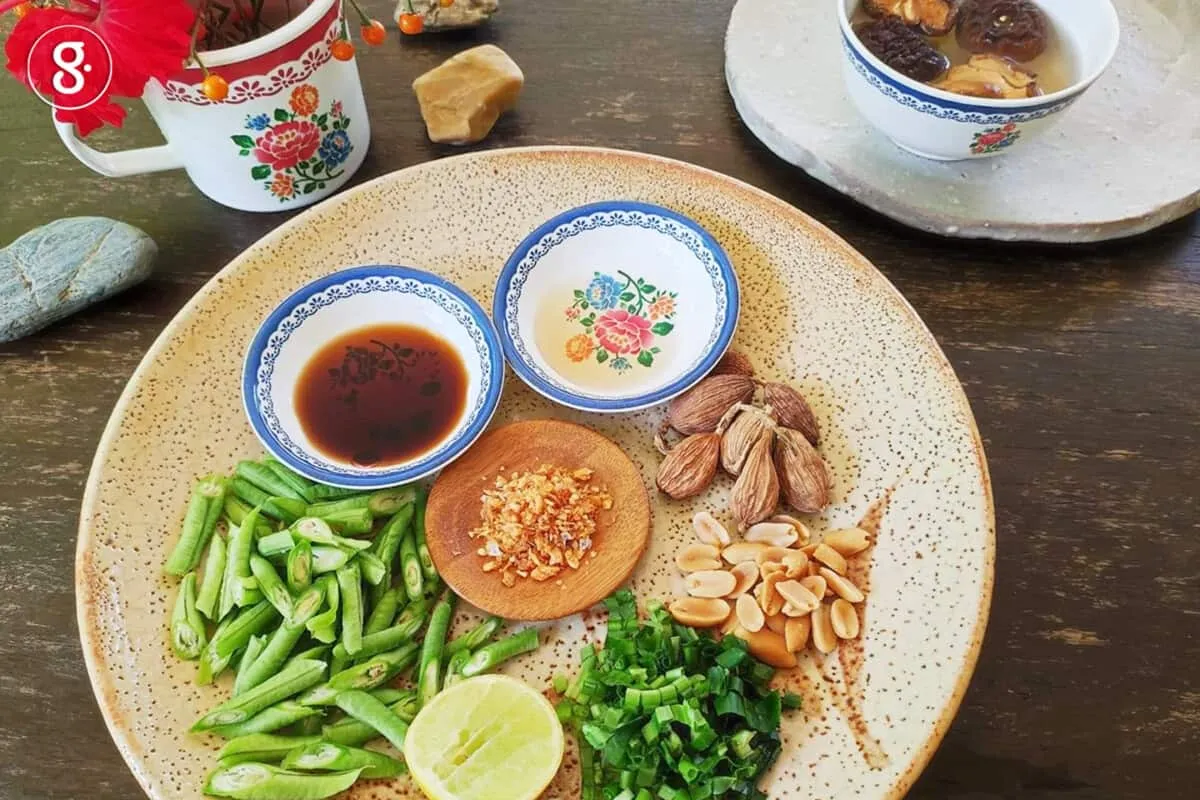 แต่พอเราละเลิกกินเนื้อสัตว์ ทำให้เราต้องปรับสูตรของตัวเอง แต่ยังให้ได้กลิ่นอายก๋วยเตี๋ยวสุโขทัยแบบของที่บ้าน สูตรดั้งเดิมคุณยายจะใช้ก๋วยเตี๋ยวเส้นเล็กมาลวกให้เส้นยังหนึบ ๆ อยู่ แล้วใส่น้ำนิดหน่อยพอขลุกขลิก ใส่น้ำมันหมูที่ได้จากการทำหมูโค้วคลุกให้เข้ากัน ปรุงรสด้วยน้ำตาลปี๊บ น้ำปลา มะนาว และท็อปด้วยถั่วฝักยาวหั่นแฉลบลวก ผักชีใบเลื่อยหั่นฝอย หัวไชโป๊วหวานสับละเอียด ถั่วลิสงคั่วหอม ๆ ตำพอแหลก กระเทียมเจียว แค่นี้เป็นอันเสร็จ