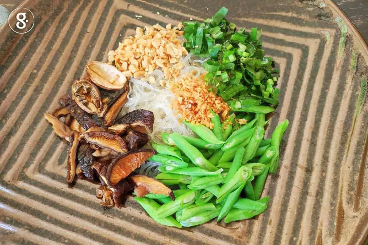 5. ปรุงรสวุ้นเส้นด้วยซีอิ้วขาว น้ำตาลปี๊บ มะนาว คลุกให้เข้ากัน โปะเครื่องที่เตรียมไว้ คือถั่วฝักยาวลวก เห็ดหอมผัด ผักชีใบเลื่อยหั่นฝอย ถั่วลิสงตำและกระเทียมเจียว