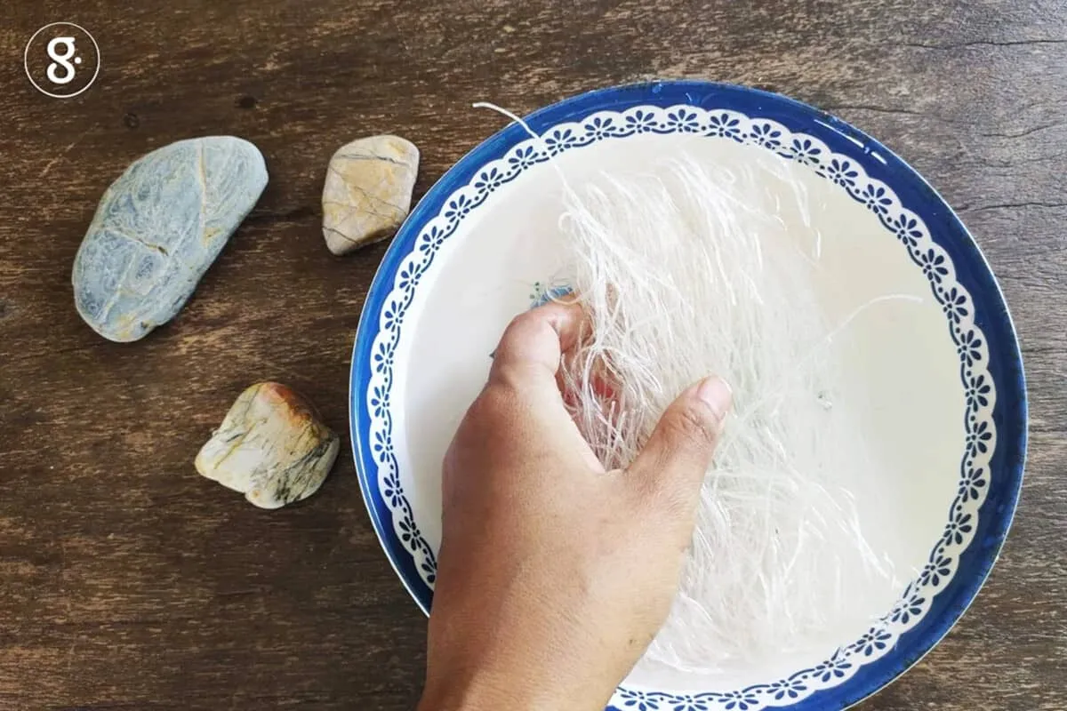 1. แช่วุ้นเส้นในน้ำให้นิ่มแล้วนำไปลวก พักไว้