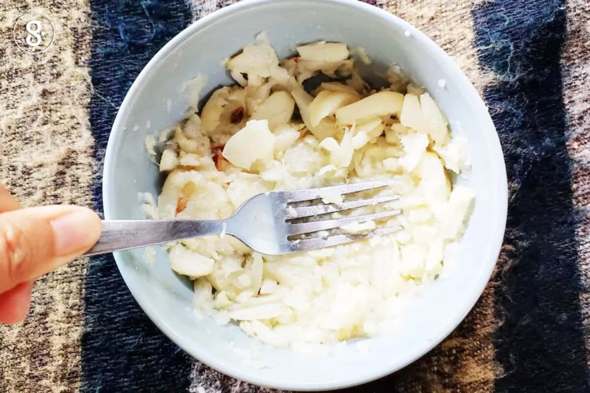 2. ฝานด้านบนของหัวกระเทียมแล้วหยอดน้ำมันไปด้านบนสักเล็กน้อย นำไปย่างในหม้ออบลมร้อน ด้วยอุณหภูมิ 180 องศาเซลเซียส ประมาณ 10 นาที เมื่อสุกแล้วบีบเนื้อกระเทียมออกจากเปลือก บดด้วยส้อมหรือใส่เครื่องปั่นให้ละเอียด