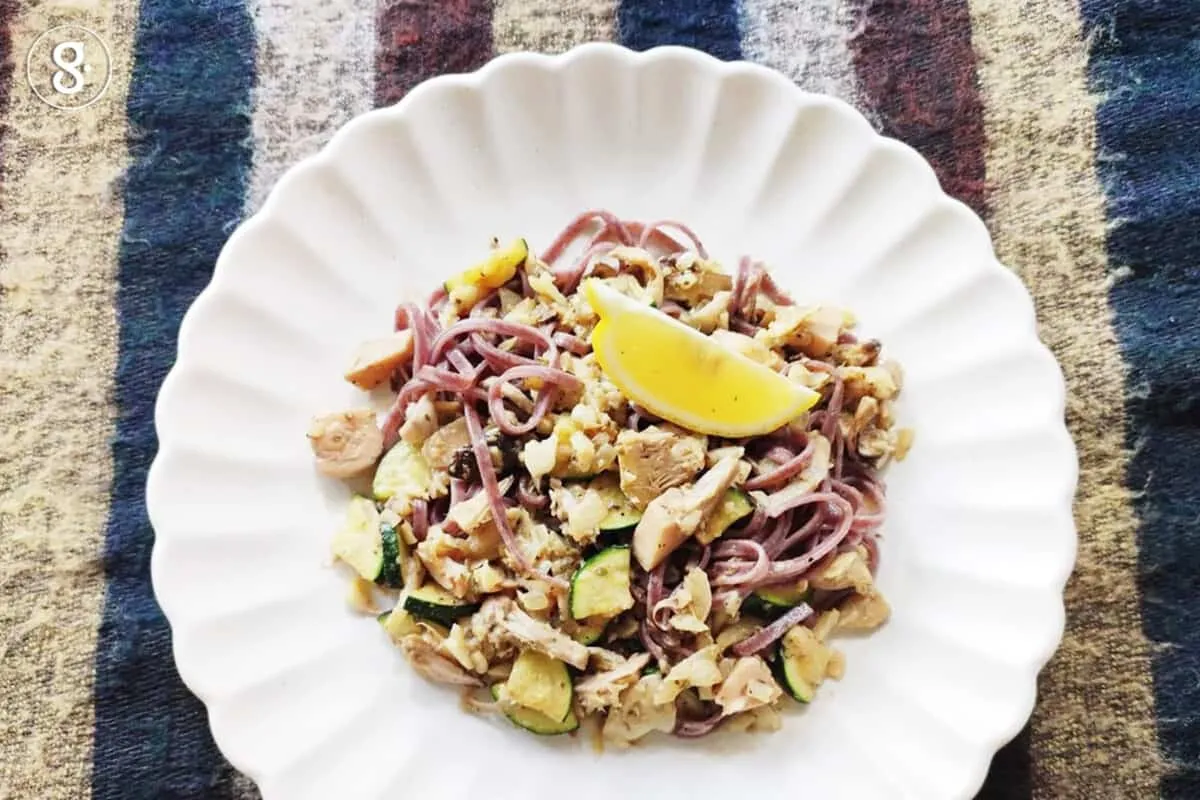 5. นำมาคลุกเคล้ากับเส้นที่ลวกแล้ว ตกแต่งจานด้วยเลมอนฝาน ก่อนทานบีบเลมอนลงไปเพื่อตัดรสให้กลมกล่อมมากยิ่งขึ้น