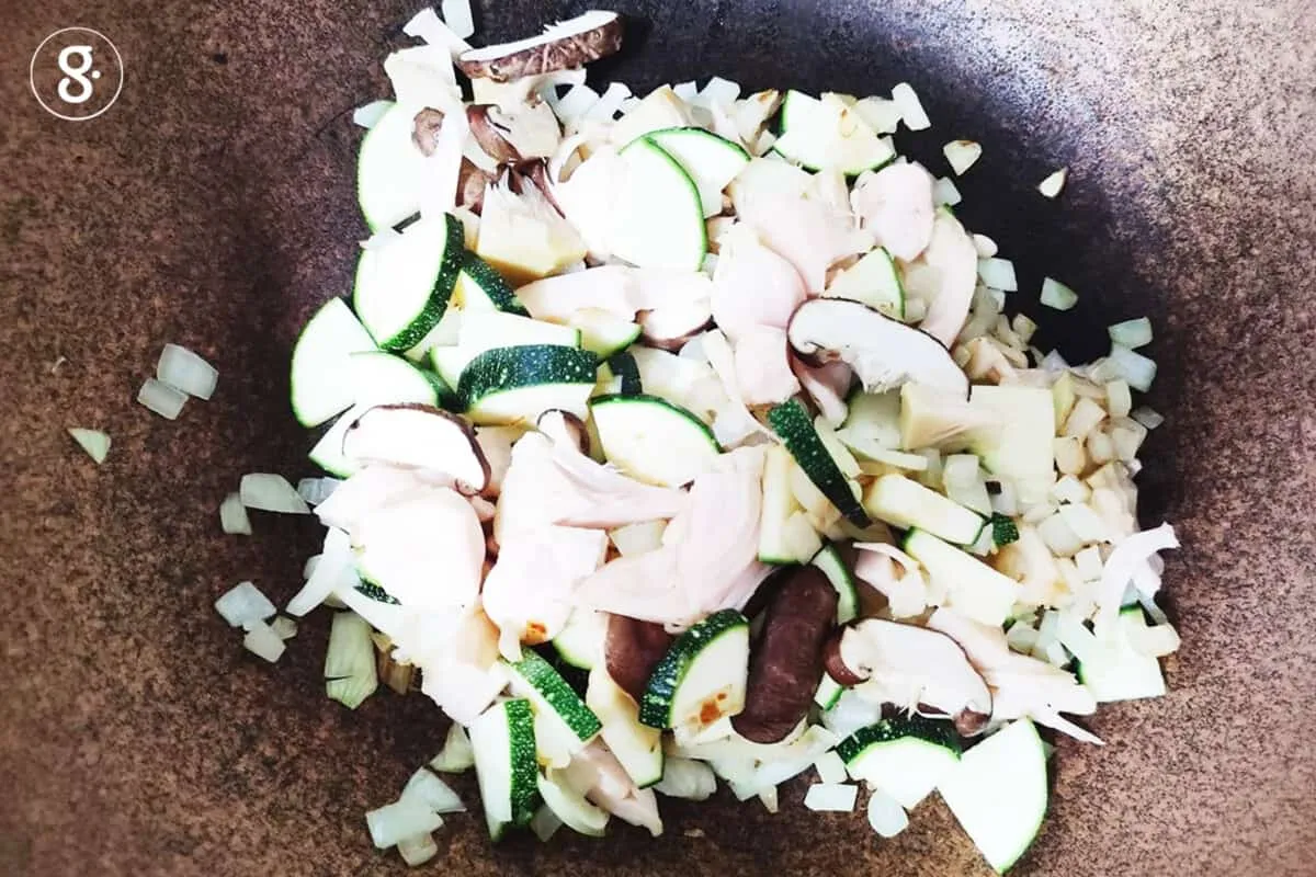 3. ตั้งกระทะ ใส่น้ำมันแล้วผัดหัวหอมหั่นเต๋าจนหอม ใส่ขนุน ซูกินีและเห็ดหอมแล้วผัดต่อ