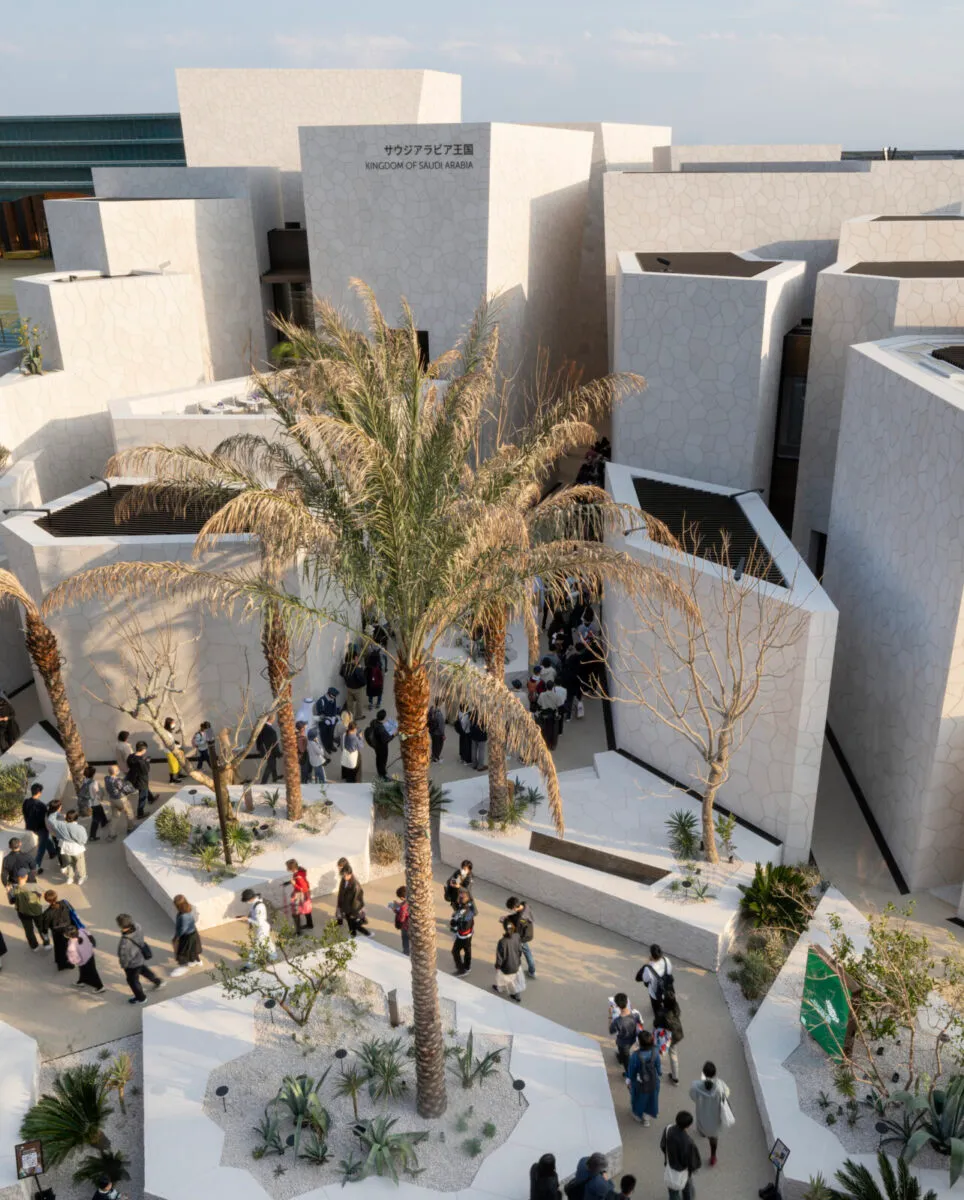 พาวิลเลียนนี้น่าจะโดดเด่นเรื่องสถาปัตยกรรมที่สุดแล้ว ไม่ใช่เพราะว่าดีไซน์สวยเก๋แปลกตากว่าคนอื่น หรือผู้อยู่เบื้องหลังการออกแบบคือบริษัททรงอิทธิพลแห่งวงการสถาปัตยกรรมโลกอย่าง Foster + Partners ทว่าแท้จริงแล้วมันคือสถาปัตยกรรมที่อธิบายเรื่องราวของ Form & Function สะท้อนถึงวิถียิ่งยืนเรียบง่ายแต่ทรงพลังทั้งยังบ่งบอกรากแห่งวัฒนธรรมท้องถิ่นดั้งเดิมได้อย่างยอดเยี่ยม หมู่สถาปัตยกรรมอาคารแท่งทรงเหลี่ยมต่างระดับนี้สร้างขึ้นโดยได้แรงบันดาลใจมาจากหมู่บ้านโบราณกลางทะเลทรายในภูมิภาคนาจด์ (Najd) ที่เป็นบ้านดินทรงสี่เหลี่ยมตามแบภูมิปัญญาดั้งเดิมเรียงรายอยู่กลางผืนทะเลทราย ช่องว่างระหว่างอาคารนอกจากจะกลายเป็นเส้นทางเดินเชื่อมต่อกันไปมาแล้วก็ยังกลายเป็นช่องลมหมุนเวียนอากาศทำให้อากาศระบายและถ่ายเทได้ดีทั้งยังช่วยลดอุณหภูมิความร้อนได้ในตัว แนวคิดนี้ทำให้พาวิลเลียนของซาอุดิอารเบียมีลมเย็นพัดผ่านตลอดทั้งวัน เดินเล่นสบาย และสถาปัตยกรรมกลายเป็นอาคารประหยัดพลังงานที่มีประสิทธิภาพไปพร้อมกันด้วย นอกจากนี้หากมอบมุมบน (Top View) เราจะเป็นผังรวมของหมู่อาคารที่ดูคล้ายผืนดินแห้งแล้งแตกระแหงซึ่งสะท้อนลักษณะของภูมิภาคตะวันออกกลางได้อย่างมีเอกลักษณ์ จุดนี้เองยังถูกปรับนำมาใช้ในการออกแบบกระเบื้องตกแต่งผนังอาคารซึ่งทำให้สถาปัตยกรรมแห่งนี้มีเอกลักษณ์โดดเด่นไม่เหมือนใคร