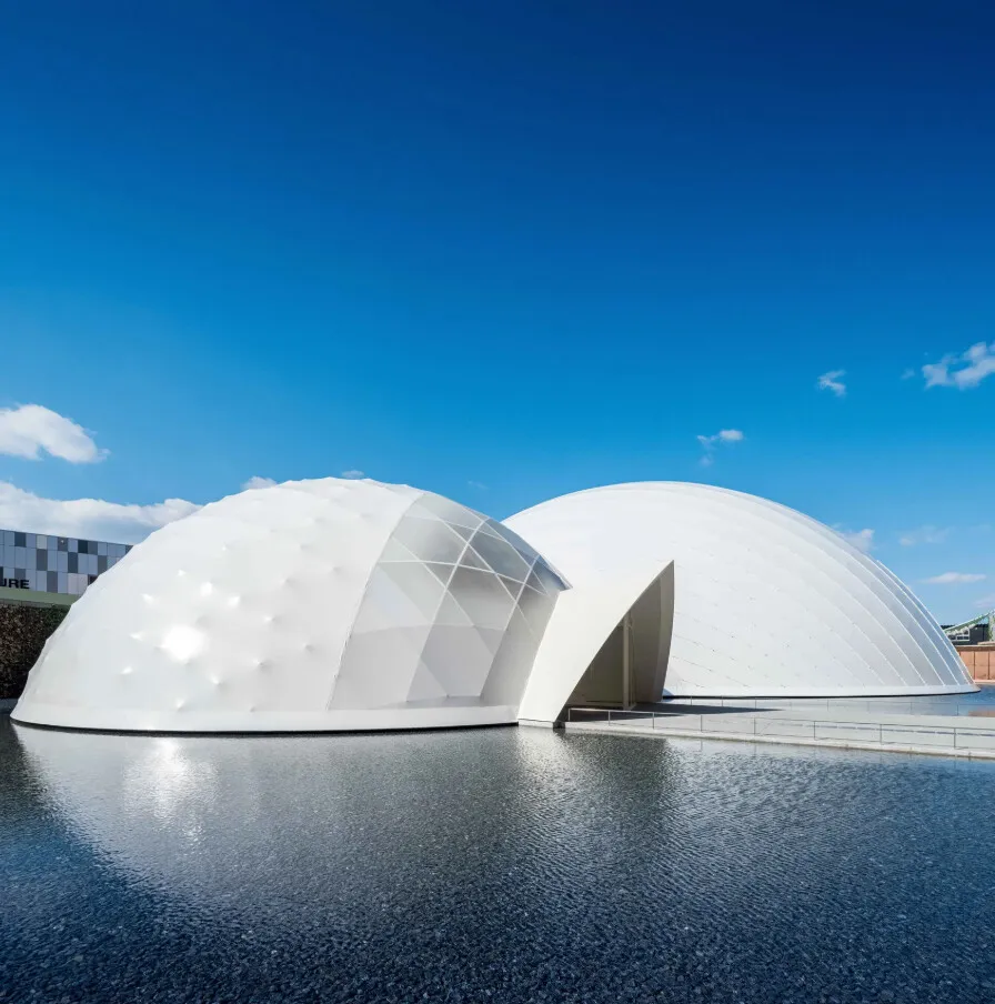 อีกหนึ่ง Signature Pavillion ของญี่ปุ่นที่โดดเด่นตั้งแต่ก่อนงานเปิดฉากเสียอีก สถาปัตยกรรมโดมขาวสามหลังเชื่อมต่อกันนี้ออกแบบโดย Shigeru Ban สถาปนิกชื่อดังชาวญี่ปุ่นโดยมุ่งนำเสนอแนวคิด Sustainable Architecture แห่งอนาคต โดมหลักหลังใหญ่ตรงกลางสร้างจากวัสดุ Carbon Fiber-Reinforced Plastic (CFRP) น้ำหนักเบาและแข็งแรง ตามด้วยโดมเล็กสองหลังขนาบข้างที่หลังหนึ่งสร้างจากโครงไม้ไผ่ลามิเนต (Laminate Bamboo) เสมือนไม้จริงและอีกหลังสร้างจากท่อกระดาษพิเศษเชื่อมต่อโครงสร้างแบบโมเลกุลเสริมความแข็งแกร่งยิ่งขึ้น จากนั้นหุ้มหลังคาโดมด้วยโพลีคาร์บอเนต (Polycarbonate) แผ่นบางอีกที ถึงแม้วัสดุจะแตกต่างกันแต่มีวัตถุประสงค์เชื่อมโยงเดียวกันนั่นคือการเลือกใช้วัสดุน้ำหนักเบาและเป็นมิตรต่อสิ่งแวดล้อมมาสานเป็นโครงสร้างหลังคาทรงโดมให้แข็งแรง รองรับน้ำหนักได้ดี เพื่อลดโครงสร้างเสารับน้ำหนักนั่นเอง นอกจากจะลดการใช้วัสดุลงได้แล้ว (ลดการใช้ทรัพยากรและลดขยะ) การเป็นอาคารไร้เสายังทำให้รื้อ ขนย้าย และก่อสร้างใหม่ได้สะดวกง่ายดาย ทำให้อาคารเกิดการใช้ซ้ำได้ ทั้งยังลดการปล่อยคาร์บอนในระบบขนส่งได้ด้วย นอกจากนี้วัสดุทั้งหมดยังสามารถนำไปรีไซเคิลได้ นับเป็นการใช้ทรัพยากรอย่างคุ้มค่าที่สุด ด้วยความที่เจ้าของโปรเจกต์นี้คือหน่วยงาน Zero Emissions Research and Initiatives (ZERI) ธีมเนื้อหาหลักจึงเป็น Marine Ecosystems and Sustainable มุ่งเน้นการสื่อสารเรื่องมหาสมุทรแห่งความยั่งยืนโดยเฉพาะเพื่อให้สอดรับกับพันธกิจ Marine Plastic Waste to Zero by 2025 ที่เกิดขึ้นจากการประชุม G20 2019 Osaka Summit ที่ผ่านมาด้วยนั่นเอง