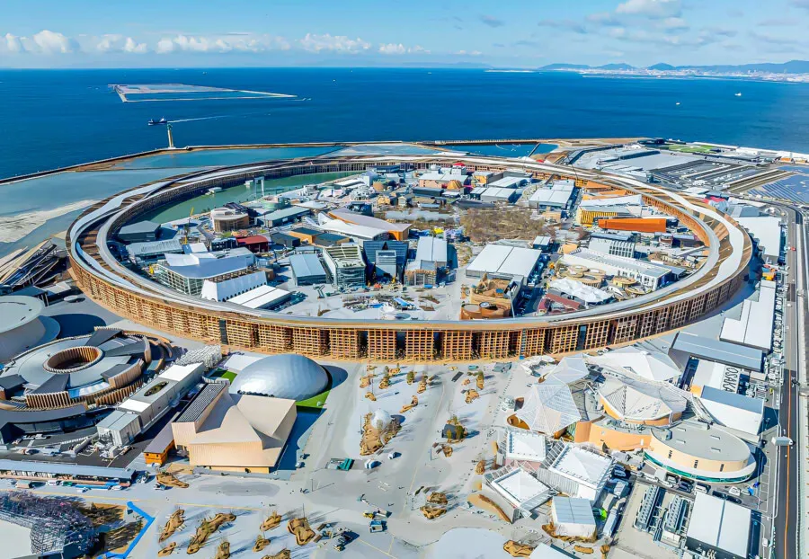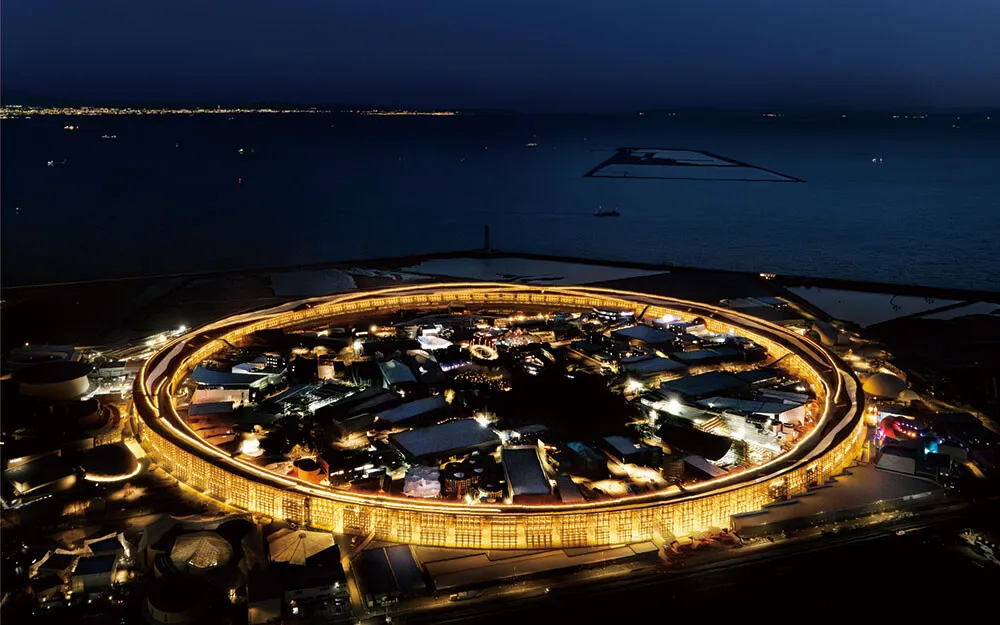 ปิดท้ายด้วยไฮไลท์ของงานอย่าง Grand Ring (大屋根リング) สถาปัตยกรรมวงแหวนไม้ทรงกระบอกที่เป็นแลนด์มาร์กประจำงานครั้งนี้ ไม่เพียงแต่ตั้งใจนำเอาภูมิปัญญาก่อสร้างแบบดั้งเดิมของตนมาเป็นซอฟท์พาวเวอร์สร้างความประทับใจเท่านั้นแต่ยังต้องการสื่อสารถึงสถาปัตยกรรมวิถียั่งยืนไปพร้อมกันด้วย สถาปัตยกรรมนี้ถูกสร้างขึ้นด้วยไม้เกือบทั้งหมดโดยนำมาจากต้นสนในป่าท้องถิ่นเป็นหลักเพื่อลดปริมาณคาร์บอนในการขนส่งให้มากที่สุด จากนั้นนำมาก่อสร้างตามภูมิปัญญาดั้งเดิมที่เรียกว่า “นูกิ (貫 / Nuki)” ซึ่งเป็นการเข้าเดือยไม้แบบญี่ปุ่นโบราณโดยไม่ใช้ตะปูหรือโลหะยึดติดโครงสร้าง โครงสร้างไม้ขนาดยักษ์นี้มีเส้นผ่านศูนย์กลางราว 675 เมตร สูง กว่า 20 เมตร ครอบคลุมพื้นที่กว่า 61,035 ตารางเมตร ด้านบนเป็นทางเดินวงแหวนโดยรอบยาวกว่า 2 กม. ได้รับการบันทึกจาก Guinness World Records ว่าเป็นสถาปัตยกรรมไม้ที่ใหญ่ที่สุดในโลกขณะนี้ ผู้ออกแบบก็คือ Sou Fujimoto สถาปนิกชาวญี่ปุ่นผู้โด่งดังระดับโลกที่สร้างสรรค์ผลงานภายใต้คอนเซ็ปต์ Unity in Diversity สื่อสารถึงเอกภาพแห่งความหลากหลายอันเป็นหัวใจของมหกรรมเอกซ์โปนั่นเอง การเลือกใช้วัสดุไม้จากธรรมชาตินอกจากจะเป็นมิตรต่อสิ่งแวดล้อมมากกว่าการเลือกใช้วัสดุสังเคราะห์อื่น ๆ แล้วก็ยังมีข้อดีตรงที่ย่อยสลายได้ง่ายและไม่ทำลายสิ่งแวดล้อมด้วย และตามวัตถุประสงค์ก่อสร้างที่วางแผนไว้ตั้งแต่แรกในเรื่องการเป็นสถาปัตยกรรมยั่งยืนนั้นภายหลังงานเอ็กซ์โปฯ ครั้งนี้ปิดฉากลงแลนด์มาร์กสุดอลังการนี้ก็จะถูกรื้อทิ้งทั้งหมด (อาจเหลือบางส่วนไว้ราว 200 เมตรเพื่อเป็นอนุสรณ์ตามคำเรียกร้อง) และนำไม้ไปใช้เป็นทรัพยากรหมุนเวียนสร้างประโยชน์ใหม่ในส่วนอื่นต่อไป … หลงเหลือไว้เพียงความทรงจำอันยิ่งใหญ่แทน