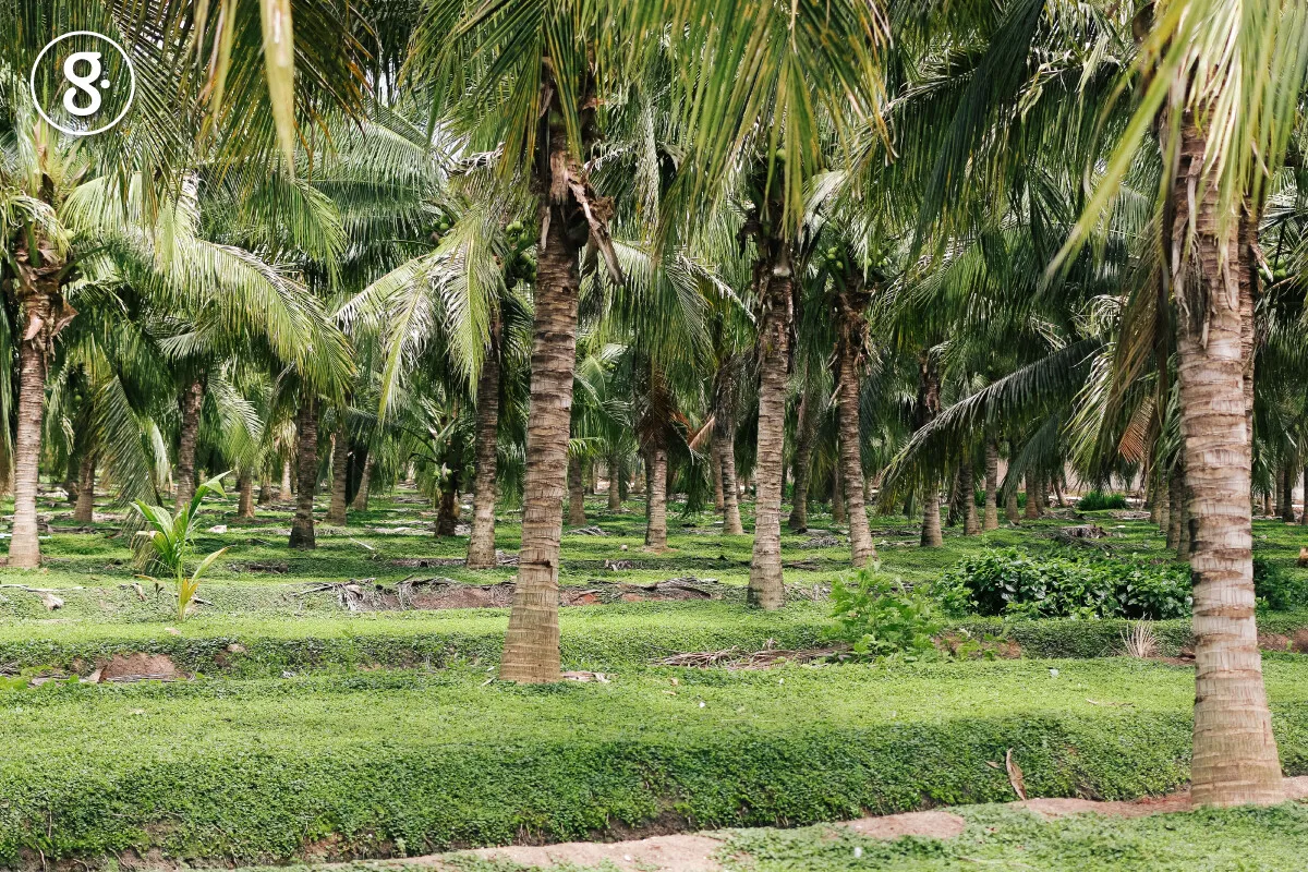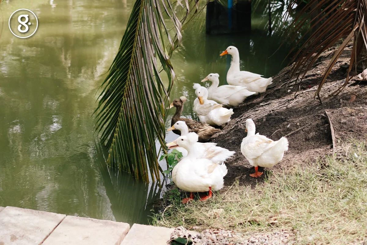 สวนมะพร้าวแห่งนี้เขียวขจีกว่าสวนที่เราเคยเห็นผ่านตา ในท้องร่องแทนที่จะปล่อยให้โล่งโล้นเป็นสีน้ำตาลดิน กลับปลูกพืชคลุมไว้แน่นหนา ในร่องน้ำกองทัพเป็ดเกินสิบชีวิตส่งเสียงทักทายแบบไม่มีทีท่าว่าจะเหนื่อย ก่อนจะทยอยตบเท้าเดินขึ้นมาโชว์ตัว