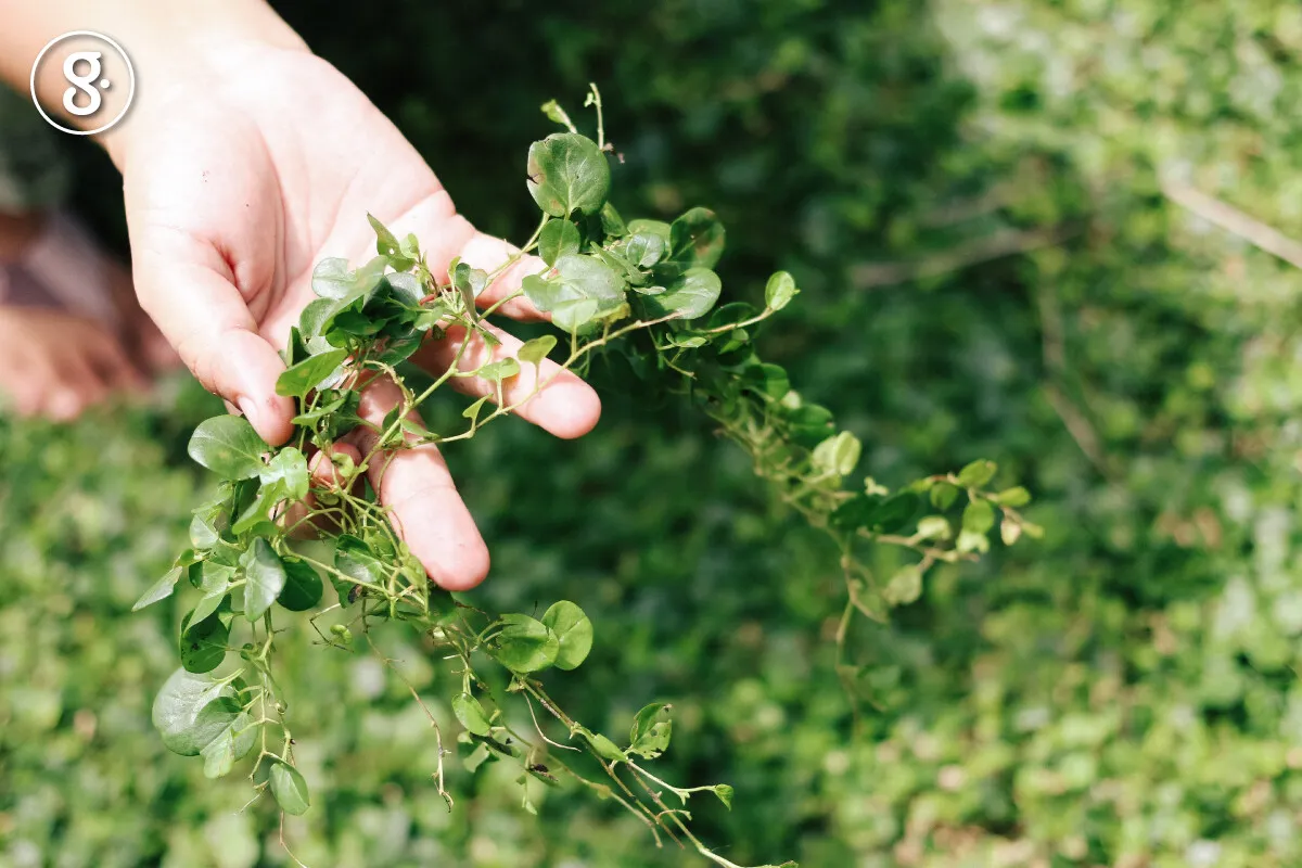 เดือนนี้ก็จะครบปีพอดี (ชี้ไปที่ท้องร่อง) เห็นใบสีเขียว ๆ ในท้องร่องไหม มันชื่อใบต่างเหรียญ สวนเราเริ่มปลูกเมื่อเดือนกันยายนปีที่แล้ว รู้ตัวอีกทีมันขึ้นเขียวเต็มไปหมดอย่างที่เห็น แต่ก่อน พ่อเราจะเซนซิทีฟกับหญ้ามาก คือเห็นเมื่อไหร่ต้องอยากถอนออกให้โล่ง ปีปีนึงสวนเราต้องจ่ายค่าคนงานกับค่ายาฆ่าหญ้าเป็นเงินหลายแสน นั่นเป็นอีกจุดที่ทำให้เรากลับมาคิดทบทวนว่าทำไมเราเอาเงินไปทิ้ง มันน่าจะมีวิธีอื่นที่ช่วยลดต้นทุนตรงนี้สิ จนไปเจอใบต่างเหรียญที่สวนหนึ่ง แต่ที่นั่นไม่ได้ปลูกเยอะแบบนี้นะ เขาบอกว่าใบนี้ดีมาก เดินย่ำหน้าฝนเท้าก็ไม่ติดโคลน เราเห็นแล้วก็จินตนาการว่าถ้าเอามาปลูกที่สวนมะพร้าวทัศนียภาพคงสวย ข้างบนเขียวจากใบมะพร้าว ข้างล่างเขียวจากใบต่างเหรียญ ปลูกไว้เพื่อคลุมดินคลุมหญ้า ช่วยไม่ให้วัชพืชหรือหญ้าอื่นขึ้น ที่มากไปกว่านั้น ใบต่างเหรียญช่วยปรับปรุงดินด้วยการเก็บรักษาความชุ่มชื้นในดิน แต่เราไม่ต้องไปทำอะไร ปล่อยให้มันเลื้อยเอง ก็น่าจะประหยัดค่าใช้จ่ายได้เยอะ