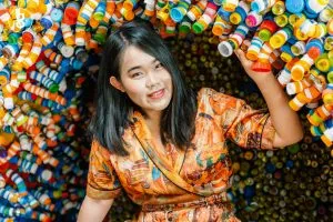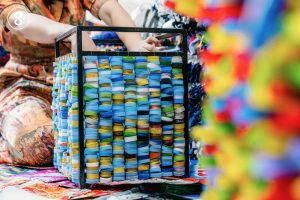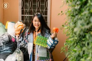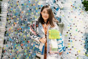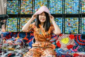เรานั่งคุยกันบนเสื่อสารพัดสีสันที่ทำขึ้นจากซองขนมกรุบกรอบ ใกล้กันมีโซฟาที่ตกแต่งด้วยพรมเช็ดเท้าจากเศษผ้าของโรงงาน ที่เธอร่วมออกแบบคู่สีให้กับกลุ่มชาวบ้านที่จังหวัดพะเยา มีแบ็กกราวนด์เป็นผนังถังขยะที่ทำขึ้นจากโครงเหล็กและฝาขวดพลาสติกวางซ้อนกันเป็นวอลล์เปเปอร์ ซึ่งงานชิ้นนี้จะนำไปจัดแสดงในงาน Mango Art Festival ในวันที่ 2-6 เมษายน ที่ล้ง 1919