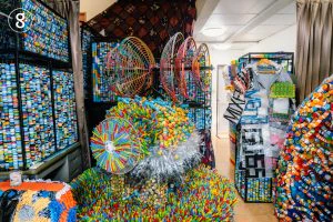 เมื่อเดินเข้าภายในตัวบ้าน เศษพลาสติกเหลือใช้อย่างแก้วพลาสติกสีสด กล่องอาหาร ฝาขวดอะลูมิเนียม ฝาขวดน้ำพลาสติก ซองขนม ซองน้ำยา ฯลฯ ถูกจับแยกใส่ลังเป็นหมวดหมู่ บางอย่างเป็นของใหม่กริบ เพราะโรงงานผู้ผลิตติดต่อขอส่งมาให้ เมื่อเขารู้ว่ามีศิลปินหญิงคนหนึ่งต้องการวัสดุพลาสติกเหลือใช้พวกนี้มาทำงาน เนื่องจากของผิดสเปก หรือเหลือค้างสต็อก แม้บางอย่างยังไม่รู้ว่าจะใช้ทำอะไร แต่อย่างน้อยก็ดีกว่าถูกทำลายทิ้งไปเปล่าๆ
