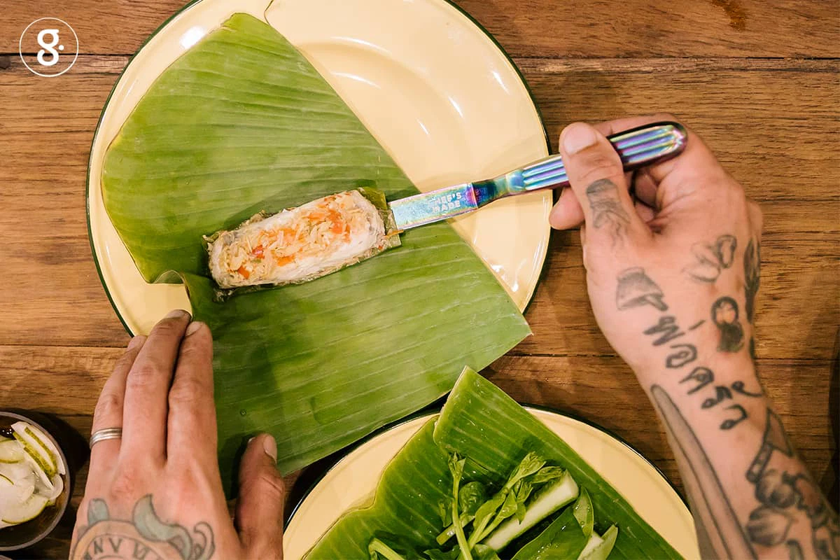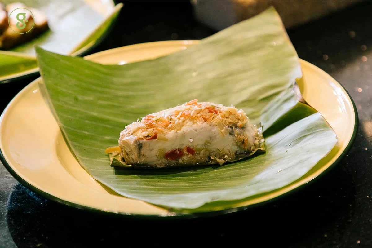 พ่อครัวบรรยายการปรุงให้เราฟังว่า เริ่มจากแล่เนื้อปลาชิ้นโตมาคลุกเคล้ากับสมุนไพรกลิ่นหอมอย่างข่า ตะไคร้ ใบมะกรูด ก่อนนำไปนึ่งไอน้ำจนเนื้อปลาสุกกำลังดี และโรยด้วยพริกชี้ฟ้าซอยเพิ่มสีสัน ซึ่งจะอร่อยขึ้นอีกเมื่อกินคู่กับน้ำพริกปลาย่างสูตรพิเศษที่เข้มข้นถึงใจ แกล้มด้วยผักพื้นบ้านสดกรอบ