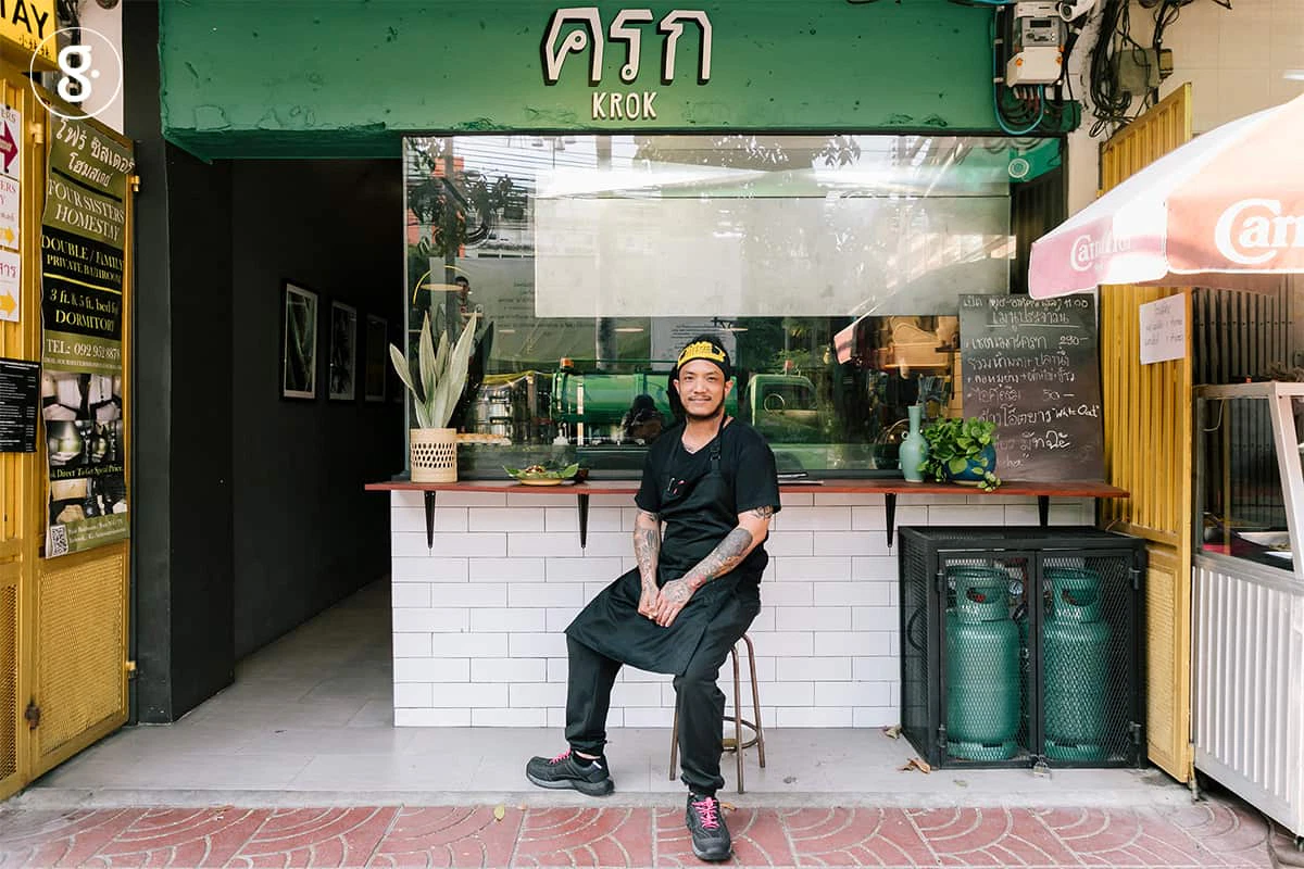 นอกจากครกจะเป็นเครื่องครัวหลักของร้าน ‘ครก’ (Krok) ยังคือชื่อของร้านอาหารร้านนี้เช่นกัน จึงไม่ใช่เรื่องน่าแปลกใจเมื่อเรากวาดสายตาพบครกหินเรียงรายอยู่รอบครัวของเชฟณิว และชวนให้ถามถึงที่มาที่ไปของร้านครกกับพ่อครัวผู้ออกตัวว่า ‘เพิ่งรู้จักอาหารไทย แต่ก็หลงรักหลงใจ’ อย่างเขาคนนี้