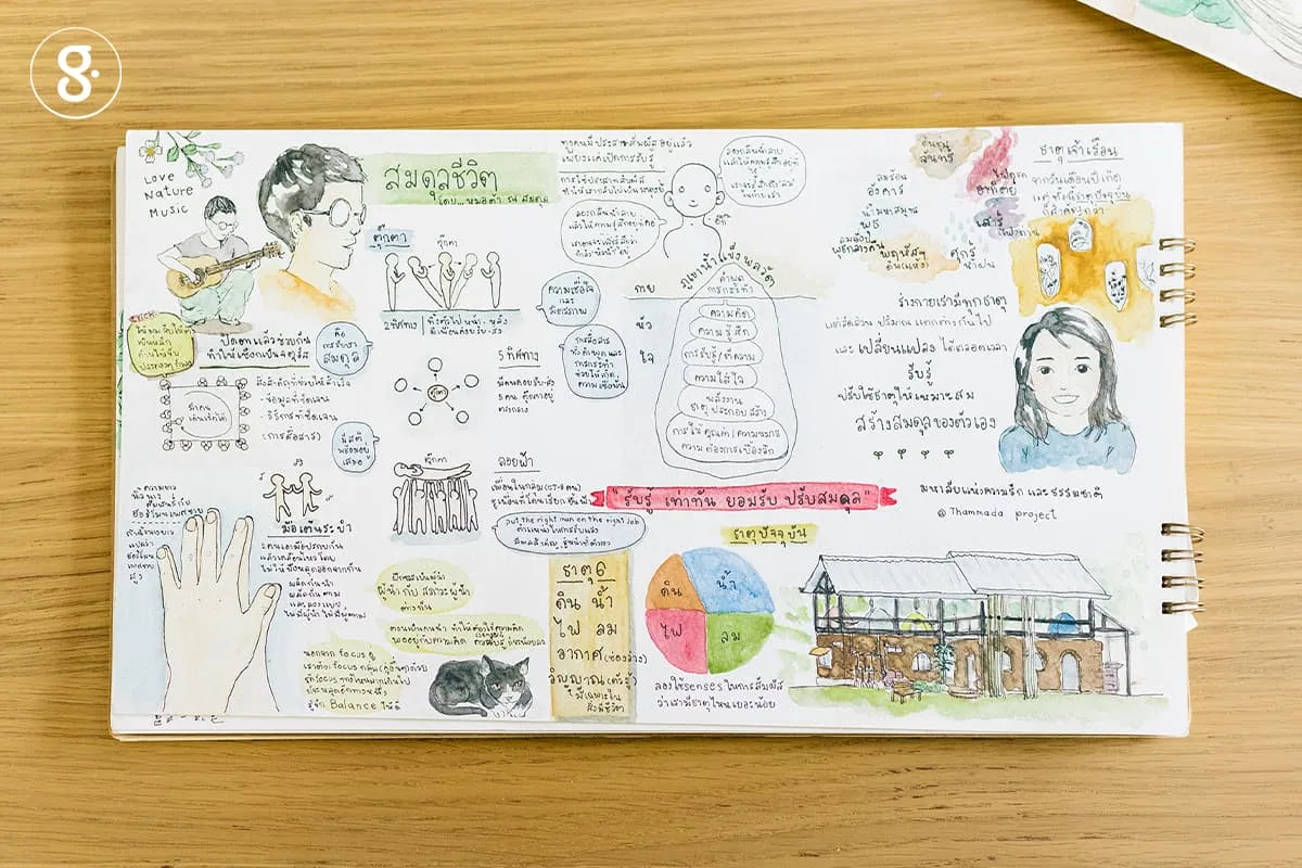 “ตั้งแต่ตอนเราทำธุรกิจ SE แล้วที่เราต้องพิทชิ่ง เราก็พูดรู้เรื่องบ้างไม่รู้เรื่องบ้าง เราไม่เข้าใจการเขียนแผนธุรกิจหรือเรื่องตัวเลขนัก ให้ทำมาเป็นตัวเลขได้ก็จริง แต่เราไม่ได้เข้าใจมันจริงๆ หรอก เราเลยเปลี่ยนมาพรีเซนต์ด้วยภาพ เราวาดภาพเล่าเรื่องธุรกิจของเราทั้งหมด คนก็พูดกันว่ามันเข้าใจขึ้นเยอะ ตอนแรกเราคิดว่าเพราะเราพูดไม่รู้เรื่องล่ะมั้ง แต่สุดท้ายเราพบว่าการสื่อสารด้วยภาพมันครอบคลุมมากกว่าการพูด เหมือนบางอย่างพูดไปมันอาจจะตกหล่น อารมณ์ไม่ชัด แต่พอใช้ภาพมันเก็บได้ครบทั้งเรื่องราวและอารมณ์”