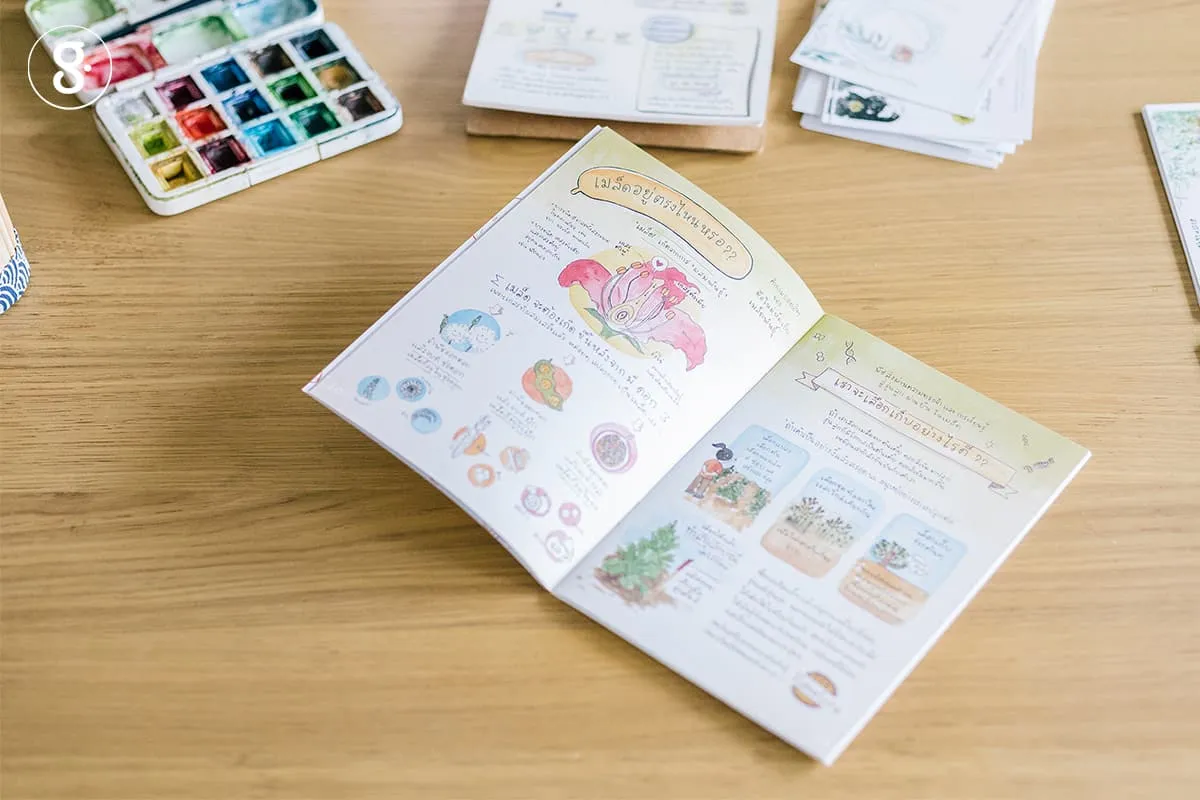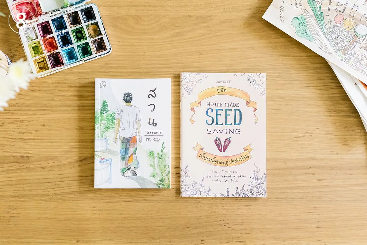“อย่างหนังสือ Homemade Seed Saving เก็บเมล็ดพันธุ์ประจำบ้าน พี่ป๊อปเขาก็มาชวนเราไปร่วมงานกับพันพรรณ เริ่มจากการที่เราไปช่วยเขาเซ็ตระบบที่นั่นใหม่ทั้งหมด ช่วยเขาทำป้าย ช่วยเขาจัดวางพื้นที่ ให้คนที่มาเป็นอาสาสมัครเข้าใจและสามารถจัดการเมล็ดพันธุ์ได้ถึงปลายทาง เพราะจริงๆ งานเก็บเมล็ดพันธุ์เป็นงานยิบย่อยมาก ถ้าเราทำผิดจุดแค่นิดเดียวงานก็พังเลย แล้วพอทำเสร็จป้ายมันออกมาอลังการมาก จนคิดว่าถ้าวันหนึ่งมันต้องเก่าไปตามกาลเวลาคงเสียดายน่าดู เลยคุยกันว่างั้นหยิบเอาชุดข้อมูลเหล่านี้มาเล่าเป็นหนังสือด้วยดีกว่า”