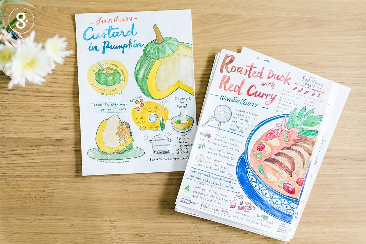 “ส่วนใหญ่มันคืออะไรที่เราอยากทำ เช่น โปสการ์ดสูตรอาหารไทย เรามองว่าคนต่างชาติชอบดูหนังสือสูตรอาหารนะ แต่มันคงยากที่เขาจะขนกลับไปทั้งเล่ม เราเลยเอาเรื่องอาหารไทยมาทำโปสการ์ด ให้แฟนเรา (เชฟจิ้น-กวีวิรัญจ์ บัวสุวรรณ) ช่วยเล่าสูตรกับวัตถุดิบต่างๆ ให้ฟัง ส่วนเราก็เอามาแปลงเป็นภาพ หรือการ์ดใส่ชา ซึ่งเกิดจากการที่บ้านเราเป็นคนจีน แล้วจะมีเวลาน้ำชาที่ทุกคนต้องมารวมกัน พูดคุยกัน เราเลยทำการ์ดที่มีถุงชาขึ้นมา พร้อมคำสอนภาษาจีนที่แม่เราชอบพูด ให้คนกลับไปชงชาแล้วแลกเปลี่ยนเรื่องราวกันจากการ์ดใบนั้น