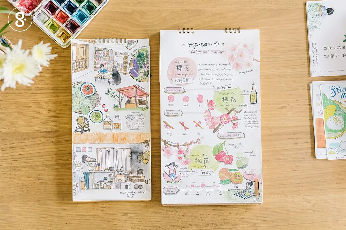 “แต่อาจจะเป็นเพราะเราทำซ้ำๆ ก็ได้ มันเลยทำได้ดี” เธอว่า พร้อมกับหันไปมองกองสมุดวาดรูปนับสิบเล่มข้างตัว ที่พอจะเป็นเครื่องการันตีได้อย่างดีถึงการฝึกฝนที่ไม่มีวันสิ้นสุดของเธอ จนทำให้ทุกวันนี้การจับพู่กันและระบายสีน้ำ กลายเป็นงานประจำที่พาเธอออกไปรู้จักโลกกว้าง และทำให้ชื่อ ‘T-ramissu’ นามปากกาชวนหิว เป็นที่รู้จักอย่างกว้างขวางในวงการตลาดสีเขียว ผ่านภาพวาดที่เราอาจเคยเห็นผ่านตากันมาบ้าง จากผลงานหนังสือ Homemade Seed Saving เก็บเมล็ดพันธุ์ประจำบ้าน ของพันพรรณ ปกหนังสือสวน (Garden) ของโจน จันใด ภาพประกอบสุดคิวท์ของถังขยะผัก Done และโปสการ์ดทำมือลายเส้นเอกลักษณ์อีกหลายชิ้น