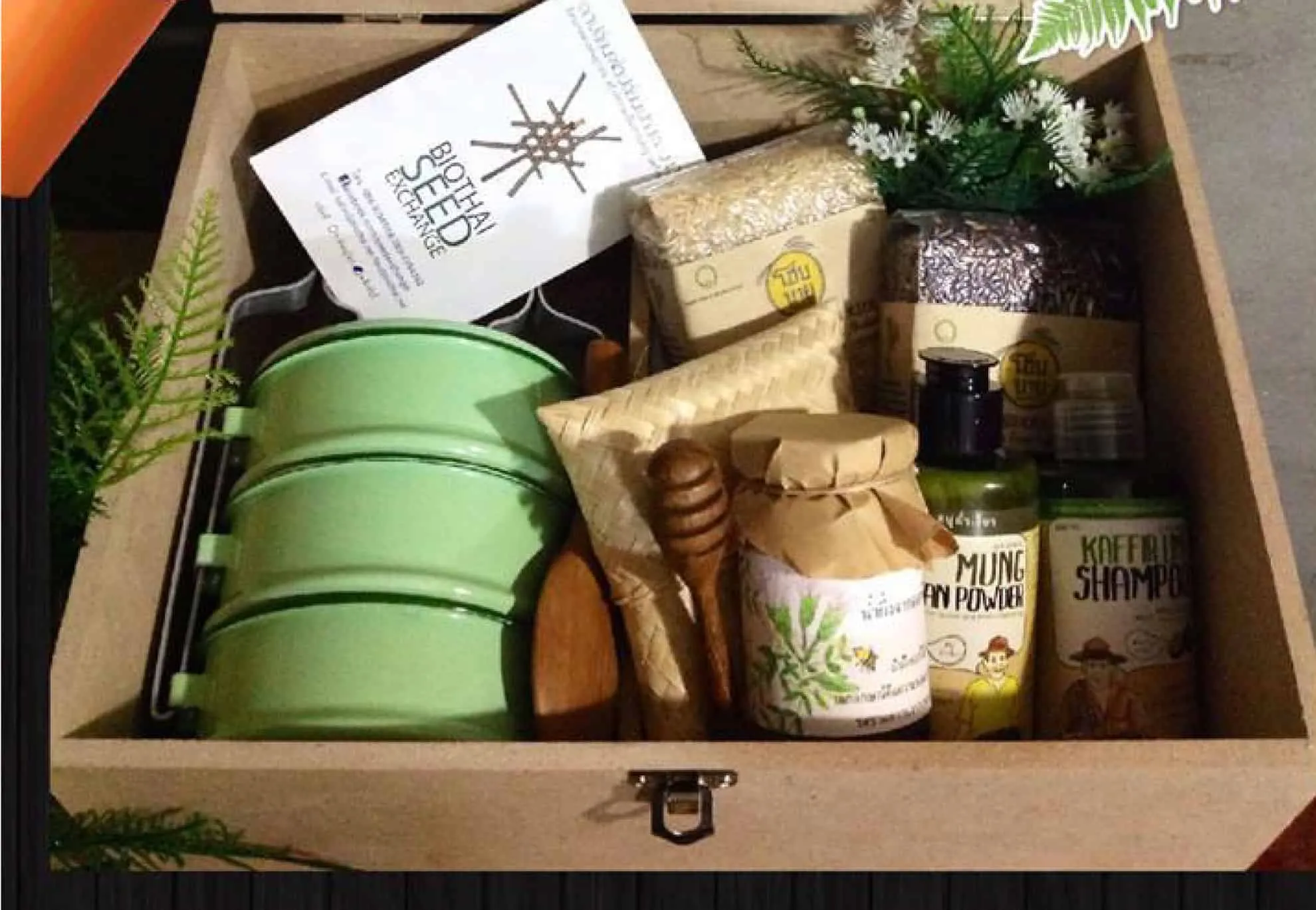 จากไอเดียที่อยากจะสื่อสารถึงการกินดีอยู่ดีมีสุข และภาพปิ่นโตที่แว้บขึ้นมาเป็นอันดับแรก จึงทำให้เกิดเป็น ชุดปิ่นโต กินดีมีสุข นี้ขึ้นมา ช่างเป็นของขวัญปีใหม่ที่น่าให้ แล้วก็ยังช่วยลดการเกิดขยะใช้แล้วทิ้ง เป็นการใช้แล้วล้างได้ไม่จำกัดครั้งอีกด้วย ในชุดนี้ ประกอบด้วย ปิ่นโตขนาดเล็กกะทัดรัดใส่ข้าว กับข้าว หรือขนมหวาน ได้ 3 ชั้น มาพร้อมกับเครื่องปรุงออร์แกนิกหลายอย่าง อาทิ ข้าวกล้อง ข้าวไรซ์เบอรี่, น้ำผึ้งดอกไม้ป่า, แชมพูมะกรูด, สบู่ถั่วเขียว เป็นต้น แล้วภาชนะยามเดินทางรุ่นคุณตาคุณยายยังเด็กใบนี้ ก็จะกลายเป็นภาชนะใส่เมนูโปรดประจำวันของคนที่คุณรักไปอีกหลายสิบปีเลยล่ะ
