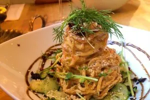 นอกจากชีสและพิซซ่าที่เปิดต่อมความตื่นเต้นให้เราแบบหยุดไม่อยู่ เมนูอื่นๆ ก็ยังเต็มไปด้วยการคิดพลิกแพลง เพื่อเอาชนะข้อจำกัดทั้งเรื่องวัตถุดิบที่ต้องใช้พืชเป็นหลัก และกรรมวิธีการปรุงที่ต้องใช้หลักการถนอมอาหารหรือพึ่งความร้อนให้น้อยที่สุด เช่น พาสต้าที่ทำจากสาหร่ายโดยใช้หลักการเดียวกับการทำวุ้นเส้น คลุกเคล้ามากับซอสครีมจากชีสเม็ดมะม่วงหิมพานต์ พร้อมจำแลงรสชาติของแซลมอนรมควันด้วยการใช้แครอทรมควันเข้ามาแทนที่ หรือซูชิทูน่าที่ใช้อโวคาโดซึ่งมีเนื้อสัมผัสใกล้เคียงกันมาแทน แถมยังเสริมความสุขภาพดีด้วยการเปลี่ยนข้าวเป็นต้นอ่อนทานตะวันงอกในม้วนซูชิแทน