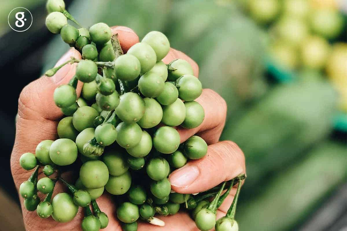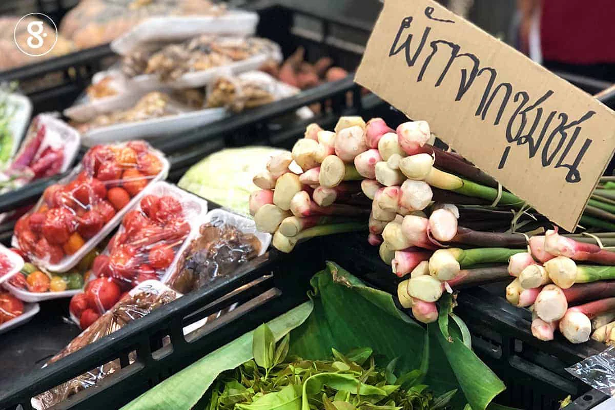 มุมน่ารักประจำร้าน คือแผงขาย ‘ผักจากชุมชน’ ที่รับผักท้องถิ่นทั้งชื่อคุ้นและชื่อแปลกหูมาจากชาวบ้านในละแวกแบบปากต่อปาก ทั้ง ผักอีตู่ (ชื่อใบแมงลัก ในภาษาอีสาน) แตงกวา มะเขือเปราะ หมากแข้ง มะเขือพวง ฯลฯ