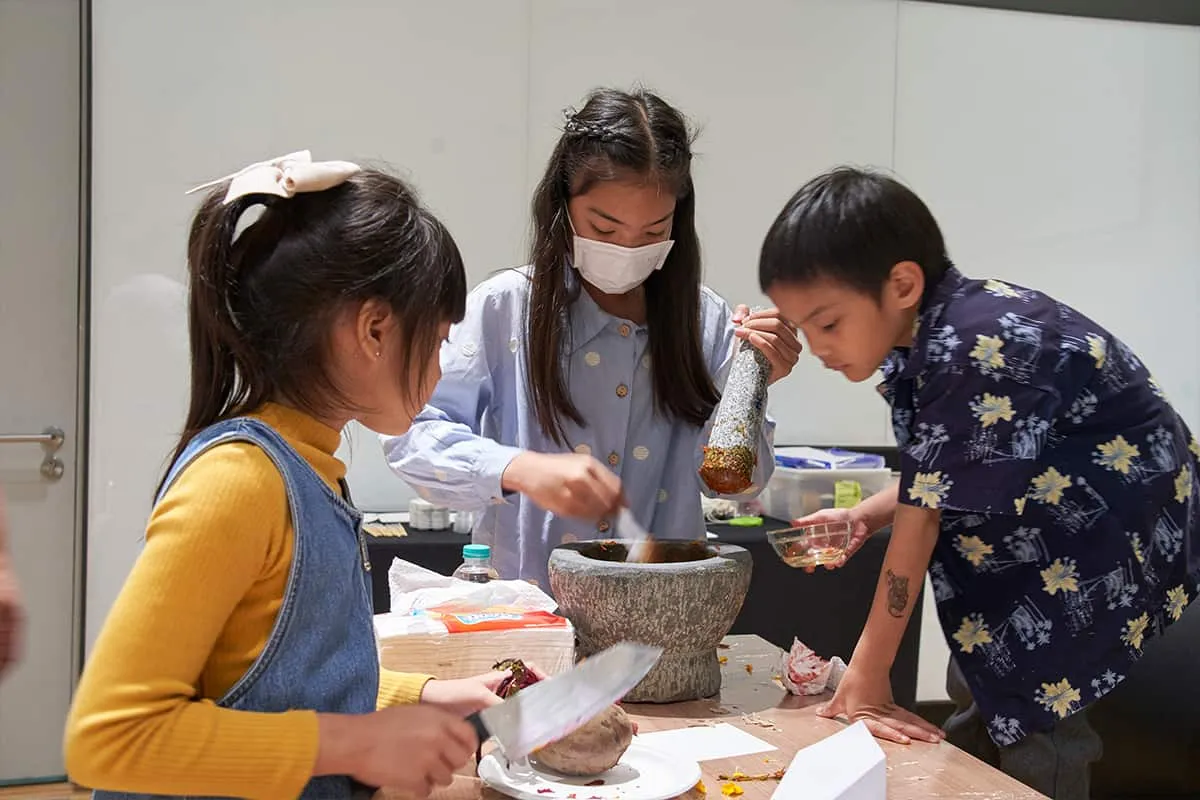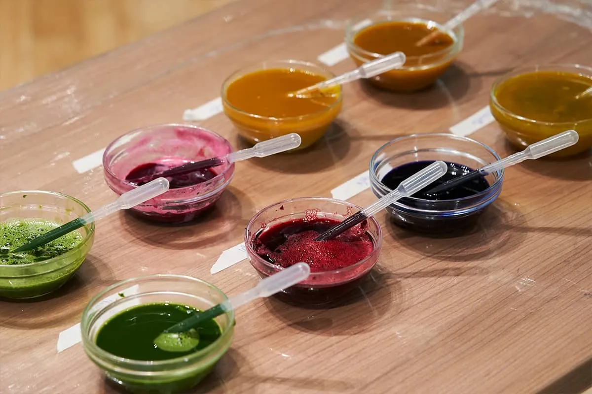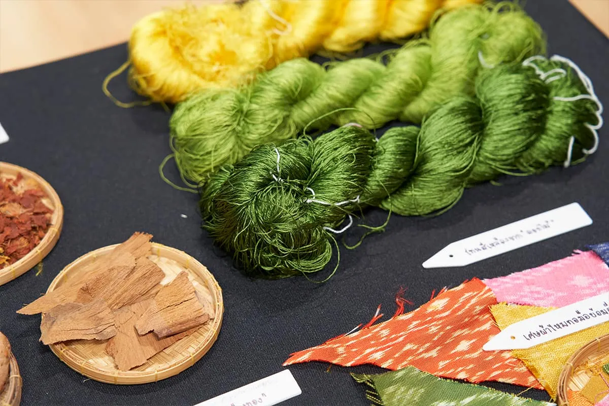 พอผู้เข้าอบรมได้เข้าใจและอินไปกับสีสันจากธรรมชาติแล้ว ช่วงบ่ายก็ได้ทำเวิร์กช็อปสกัดสีสันจากธรรมชาติกัน โดยแบ่งกลุ่มผู้ประกอบการออกเป็นสี่กลุ่ม เพื่อช่วยกันสกัดแม่สีหลัก และสีรอง จากวัตถุดิบธรรมชาติ ตั้งแต่สีเหลืองจากดอกดาวเรือง ทองอุไร ขมิ้นชัน สีเขียวจากใบเตย ใบคะน้า ก้านคะน้า สีแดงอมชมพูจากบีตรู้ต ดอกเฟื่องฟ้า สีน้ำเงินจากดอกอัญชันแห้ง แต่ละวัตถุดิบที่นำมาสกัดสีจะมีกรรมวิธีแตกต่างกันไป บ้างต้ม บ้างตำคั้นน้ำ ผู้ประกอบการก็ลงมือทำสนุกกันใหญ่ พอได้แม่สีครบแล้ว ก็ลองนำมาเพนต์ลงบนกระดาษ บนตารางสี เรียงลำดับจากสีขั้นที่หนึ่ง หรือแม่สี แล้วก็ทดลองนำแม่สีมาผสมกัน ได้เป็นสีขั้นที่สอง สนุกไปกว่านั้นคือการใช้กรดด่างใส่ผสมลงไปจะทำให้แม่สีเปลี่ยน เช่น สีน้ำเงินจากอัญชัน เมื่อถูกกรดจะกลายเป็นสีม่วง แต่พอใส่ด่างลงไปจะกลายเป็นสีฟ้าอมเขียวนิด ๆ เหมือนเทอร์ควอซ์