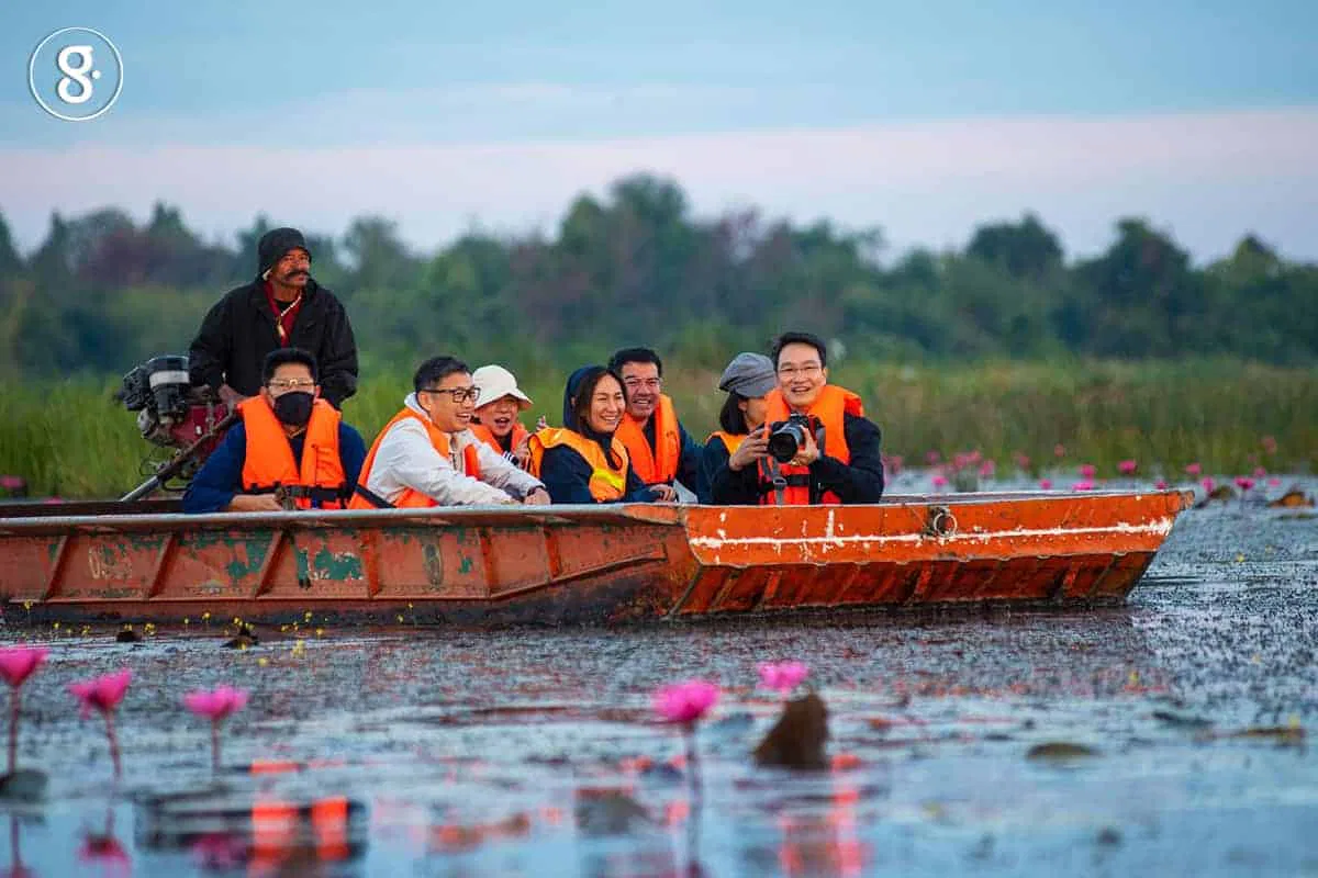 ไม่ไกลจากเวทีจัดเสวนา เป็นท่าน้ำซึ่งวันนี้มีเรือหางยาวจอดเรียงรายหลายลำ ผู้มาเยือนสามารถซื้อตั๋วล่องเรือชมความงามของแหล่งชุ่มน้ำแห่งนี้ได้ในราคาย่อมเยา เพียงรอบละ 150 บาท เท่านั้น กิจกรรมนี้แสดงถึงผลงานการออกแบบการท่องเที่ยวชุมชนบนวิถีธรรมชาติที่ชาวบ้านร่วมกันคิดและจัดขึ้น เราจึงไม่พลาดอุดหนุน พอสวมเสื้อชูชีพขึ้นเรือกันแล้ว พี่คนขับเรือก็ค่อย ๆ แล่นเรือแหวกผืนน้ำพาเราชมทิวทัศน์รอบแก่งละว้า จุดไฮไลท์คือทุ่งดอกบัวแดงที่กำลังบานสะพรั่งชวนตื่นตามาก นอกจากนี้ยังมีนกน้ำนานาชนิด และวิถีชีวิตรอบแก่งให้เห็น ไม่ว่าจะเป็นคนหาปลา ชาวบ้านที่เก็บสายบัวขาย และวิถีริมฝั่งน้ำ ที่สะท้อนถึงความอุดมสมบูรณ์ของแก่งละว้าในเขตอนุรักษ์ บนแนวทางที่ผู้คนสามารถดำรงชีวิตอยู่ร่วมกับธรรมชาติได้อย่างลงตัว ช่างน่าชื่นชม