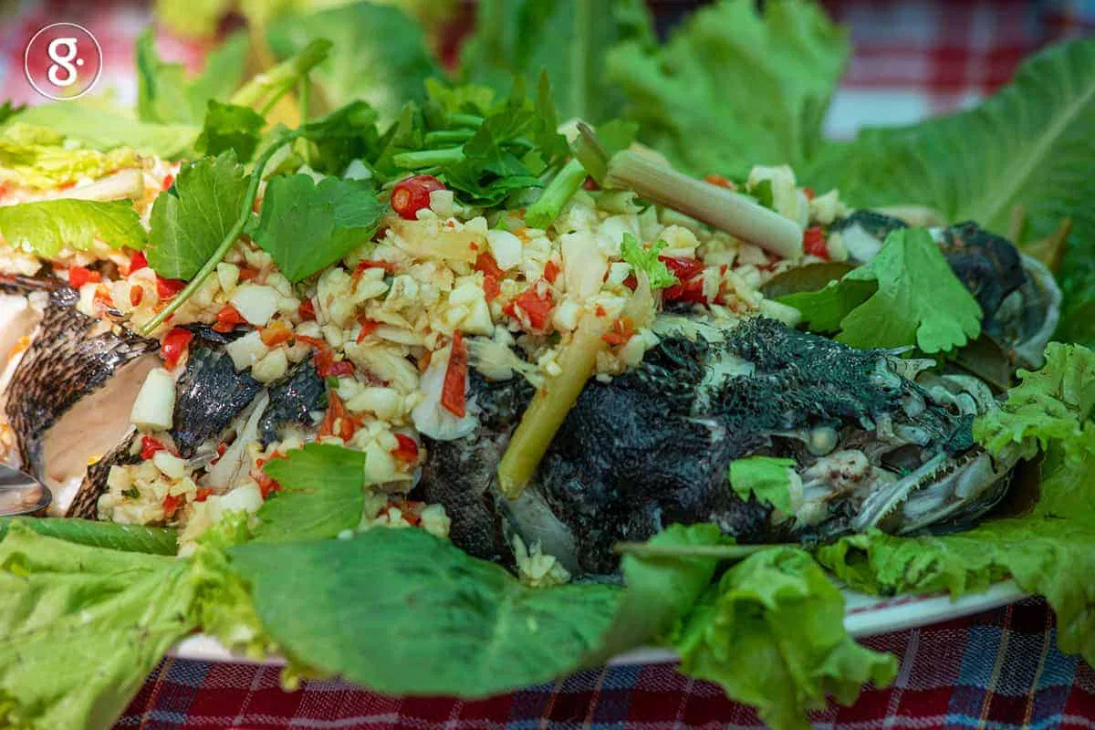 เดินต่อมาอีกไม่กี่ก้าว เห็นครกกับสากพร้อมน้ำปลาร้าต้มสุกวางหรา รู้เลยว่านั่นคือร้านส้มตำ ของกินประจำถิ่นอีสานที่ทุกวันนี้กระจายตัวไปทั่วประเทศ และเผลอ ๆ ทั่วโลกแล้วก็ว่าได้ ความพิเศษของส้มตำเจ้านี้คือ ใช้รากบัว และไหลบัวซึ่งเป็นวัตถุดิบจากแก่งละว้ามาแทนมะละกอ และเมนูส้มตำไหลบัวนี้เอง ที่วันนี้จะมีกิจกรรมชวนหัว แข่งตำส้มตำไหลบัวลีลาที่ต้องไม่พลาดชม