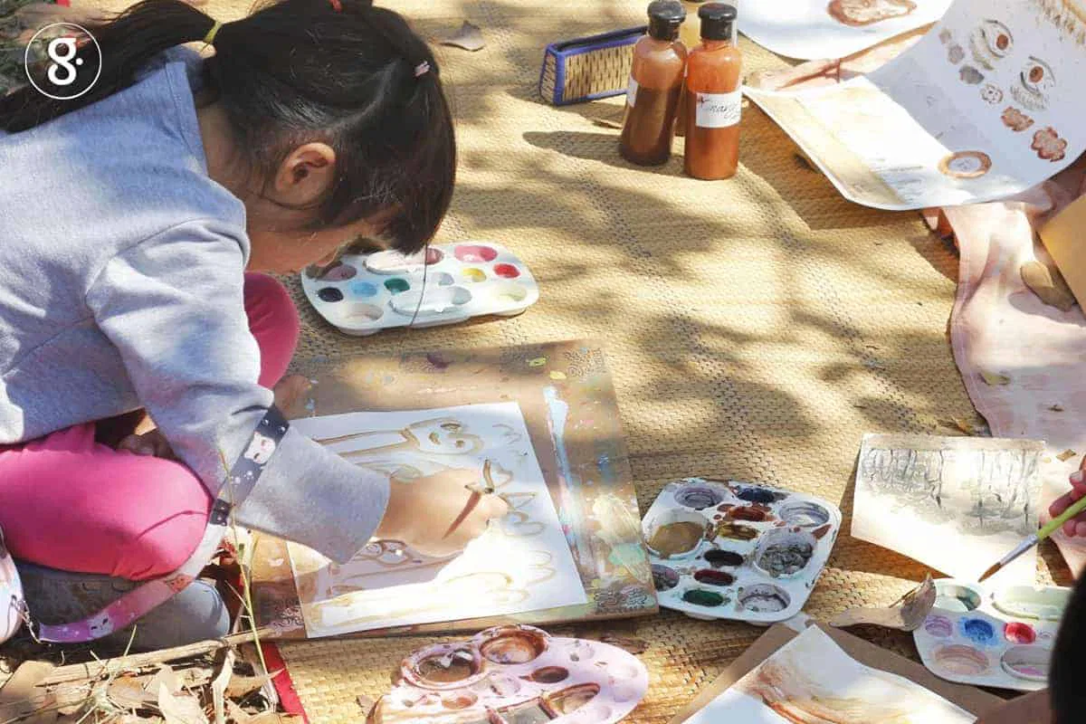 มาถึงอีกจุดไฮไลท์ที่น่าสนใจมาก และมีเด็ก ๆ ในพื้นที่นั่งล้อมวงทำกิจกรรมกัน ก็คือฐานการเรียนรู้เยาวชน์รักษ์แก่งละว้า ซึ่งได้ มหา’ลัยไทบ้าน นำโดยครูรุ่นใหม่ไฟแรง สัญญา มัครินทร์ หรือที่รู้จักกันในนาม ครูสอญอ ผู้เชื่อว่าการศึกษานั้นไม่จำเป็นต้องอยู่ในห้องเรียนเสมอไป มาเป็นผู้จัดกิจกรรมดังกล่าว ร่วมกับ อ.พรณรงค์ ชานุวงศ์ คณะสถาปัตยกรรม มหาวิทยาลัยขอนแก่น ที่พาเด็ก ๆ มาทำงานศิลปะการเพนต์ภาพด้วยหินสีธรรมชาติฟรี งานนี้ต่างคนก็ต่างโชว์ทีแปรงกันอย่างสนุกสนาน