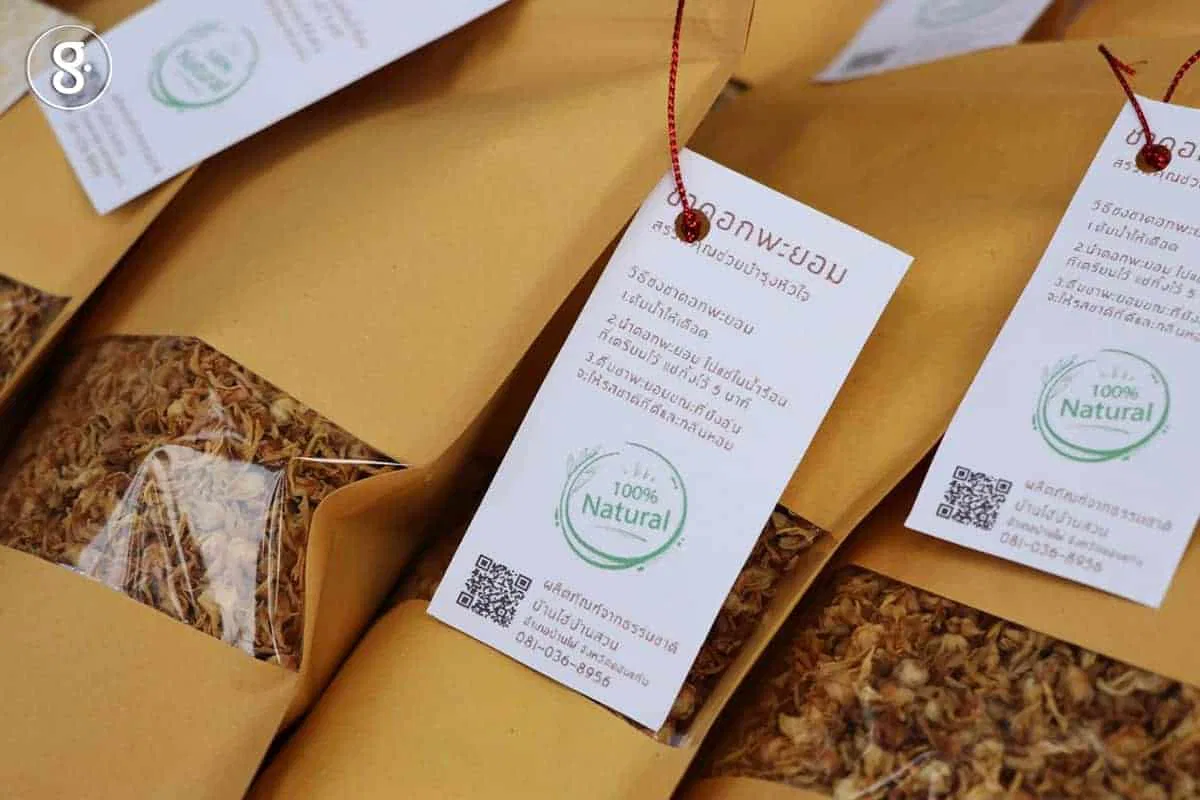 เดินชมสินค้าเพลิน ๆ ก็ไปสะดุดตากับ ชาดอกพะยอม ของบ้านไฮ่บ้านสวน ที่นำภาชนะไปรองดอกพะยอมแห้งที่ร่วงจากต้นพะยอมต้นใหญ่ในหมู่บ้านที่ชาวบ้านอนุรักษ์ไว้