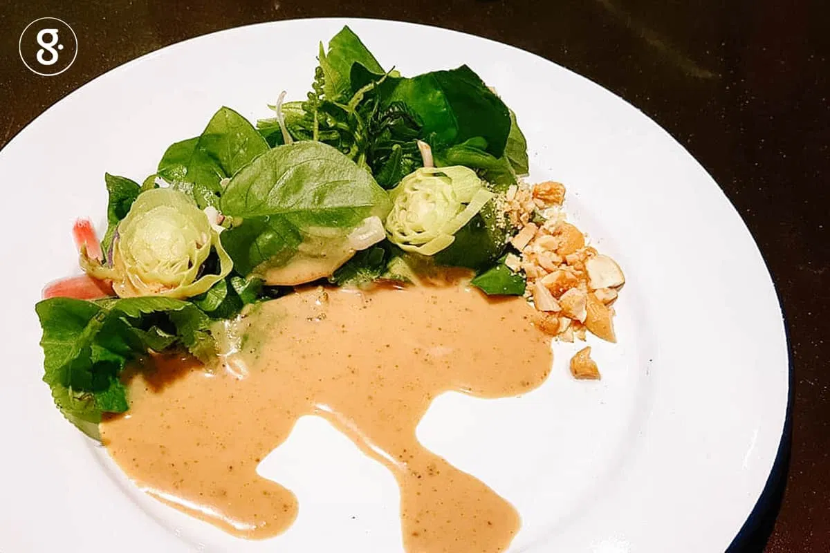 พอเรากำลังนึกถึงผัก จานผักก็มาทันที ผักกูดในน้ำสลัดปลากุเลา เป็นสไตล์น้ำสลัดแขกที่ไม่ค่อยสามารถหาทานได้ในเมือง แต่มีมากที่สามจังหวัดชายแดนใต้ พิเศษตรงที่ใส่ปลากุเลาบดกับมะม่วงหิมพานต์ลงไปด้วย ทำให้มีรสความนัว อร่อยเลย ส่วนของผักนั้นก็เป็นผักพื้นบ้านอย่าง ดอกขมิ้น ผักน้ำ และดอกดาหลา ซึ่งขึ้นเยอะมากริมแม่น้ำปัตตานี ที่สำคัญยังมีผักกูด ที่เป็นเป็นสัญลักษณ์ของการปลอดสารพิษ ดังนั้นจานนี้เราไม่ต้องกังวลเรื่องสารพิษเลย