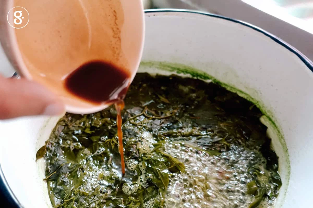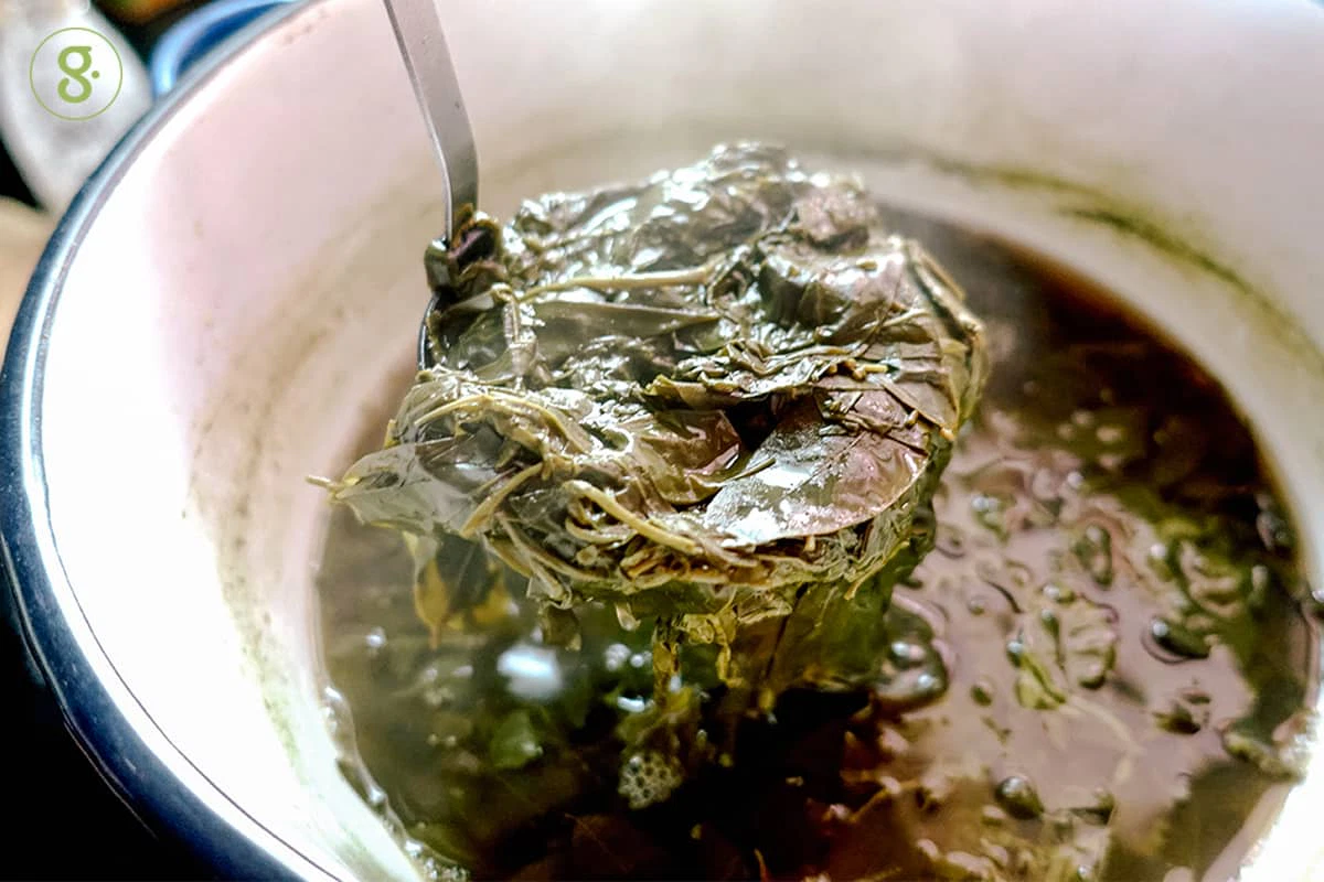 ใบขี้เหล็กต้มน้ำเกลือ 20 นาที และคั้นเอาน้ำขมออกจนหมด