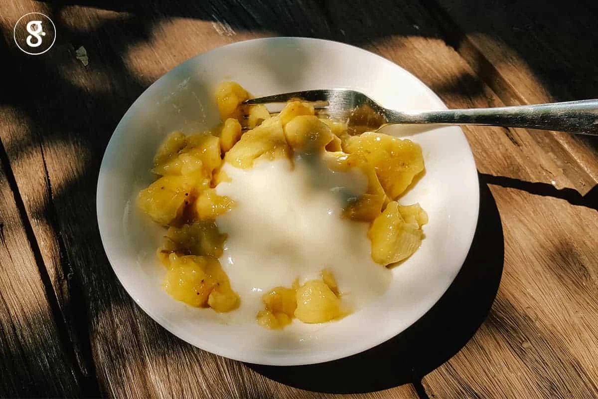 1. บี้กล้วยหอมด้วยส้อมจนละเอียด (หรือใช้เครื่องบดก็ได้ ถ้ากล้วยหอมยังไม่งอมมาก) แล้วเติมโยเกิร์ตลงไปผสม บี้ให้เข้ากันอีกครั้ง แล้วเติมนมสด คนส่วนผสมทั้งหมดให้เข้ากัน