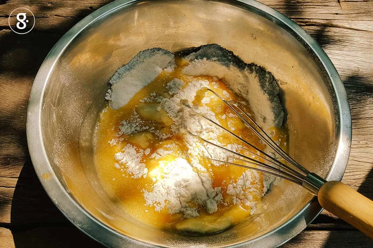 4. ใส่ไข่ไก่และน้ำมันที่ตีเข้ากันแล้วลงในของแห้ง (ค่อยๆ เติมทีละครึ่งก็ได้) คนให้เข้ากัน จากนั้นเติมเนื้อกล้วยหอมที่บดแล้วตามลงไปช้าๆ คนส่วนผสมทุกอย่างให้เข้ากัน
